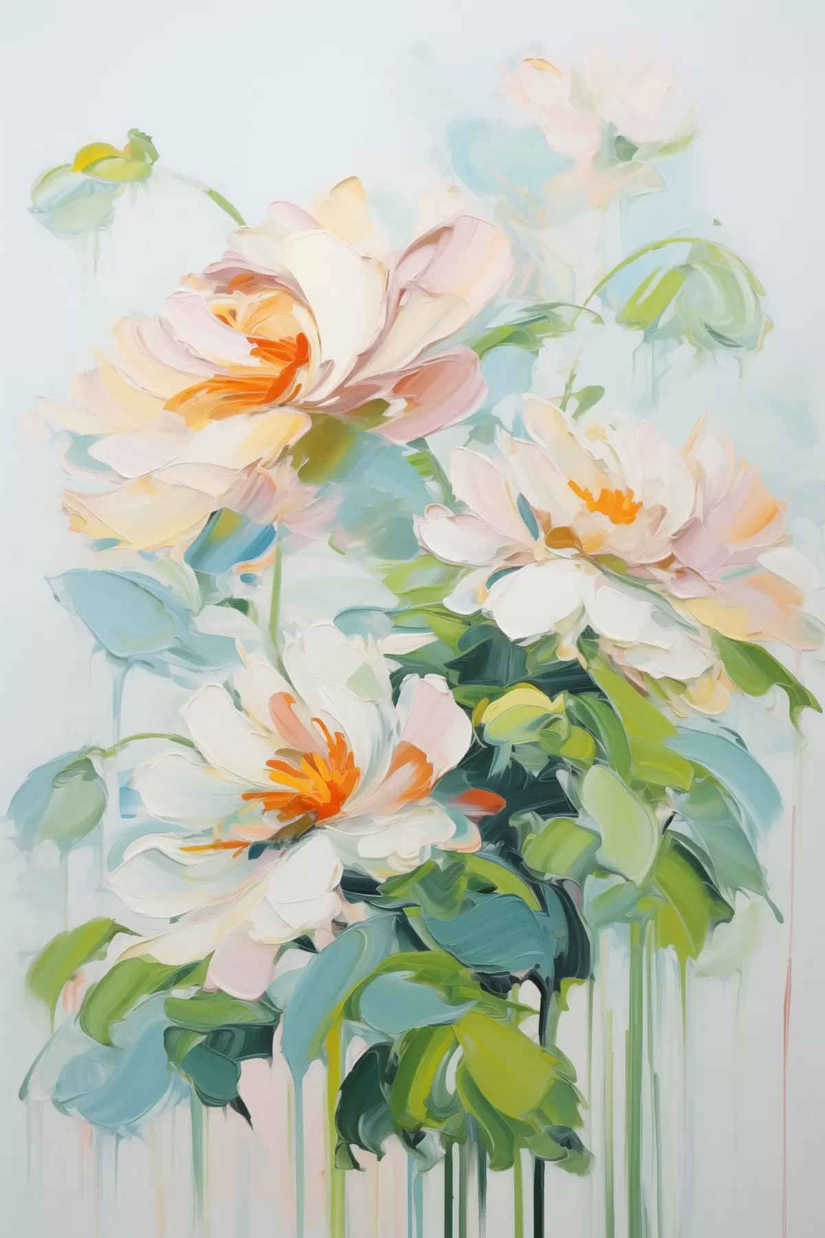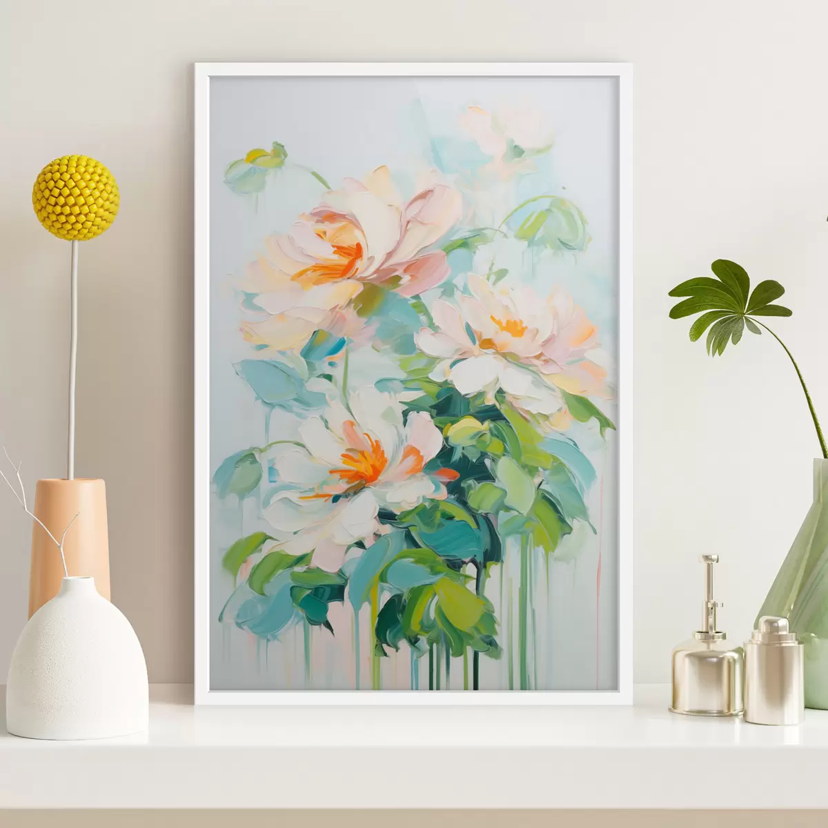 Plakatas Baltos ir pastelinės persikų gėlės, žali lapai, minkšti potėpiai teptuku, aliejinės tapybos imitacija, šviesiai mėlynas fonas f45550