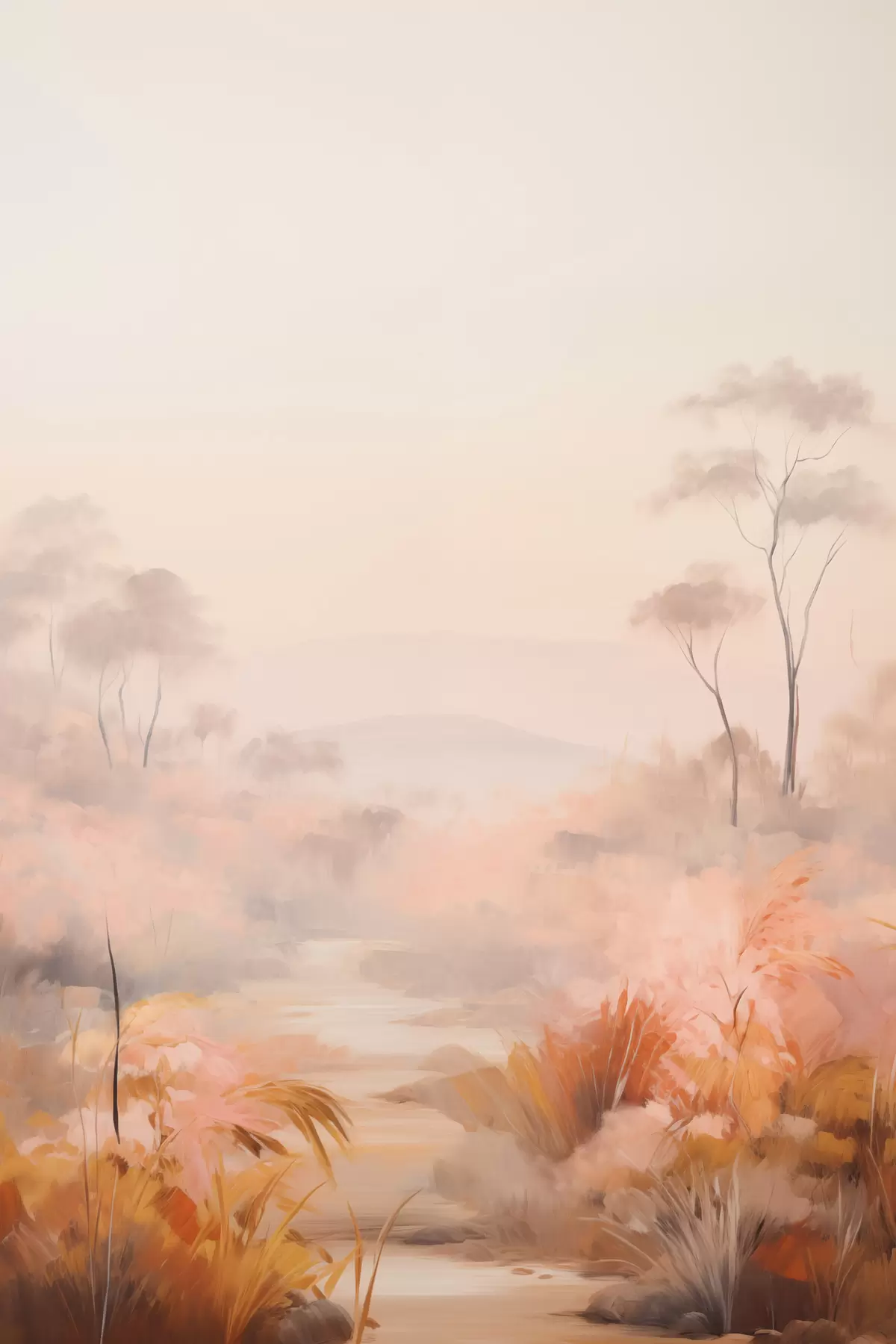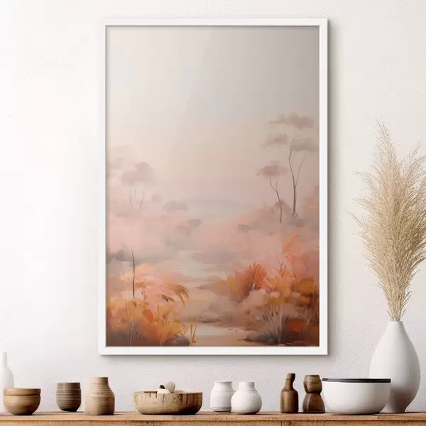 Plakatas Kraštovaizdis su rausvų, oranžinių ir rudų atspalvių krūmais ir medžiais, fone - kalnai f45553