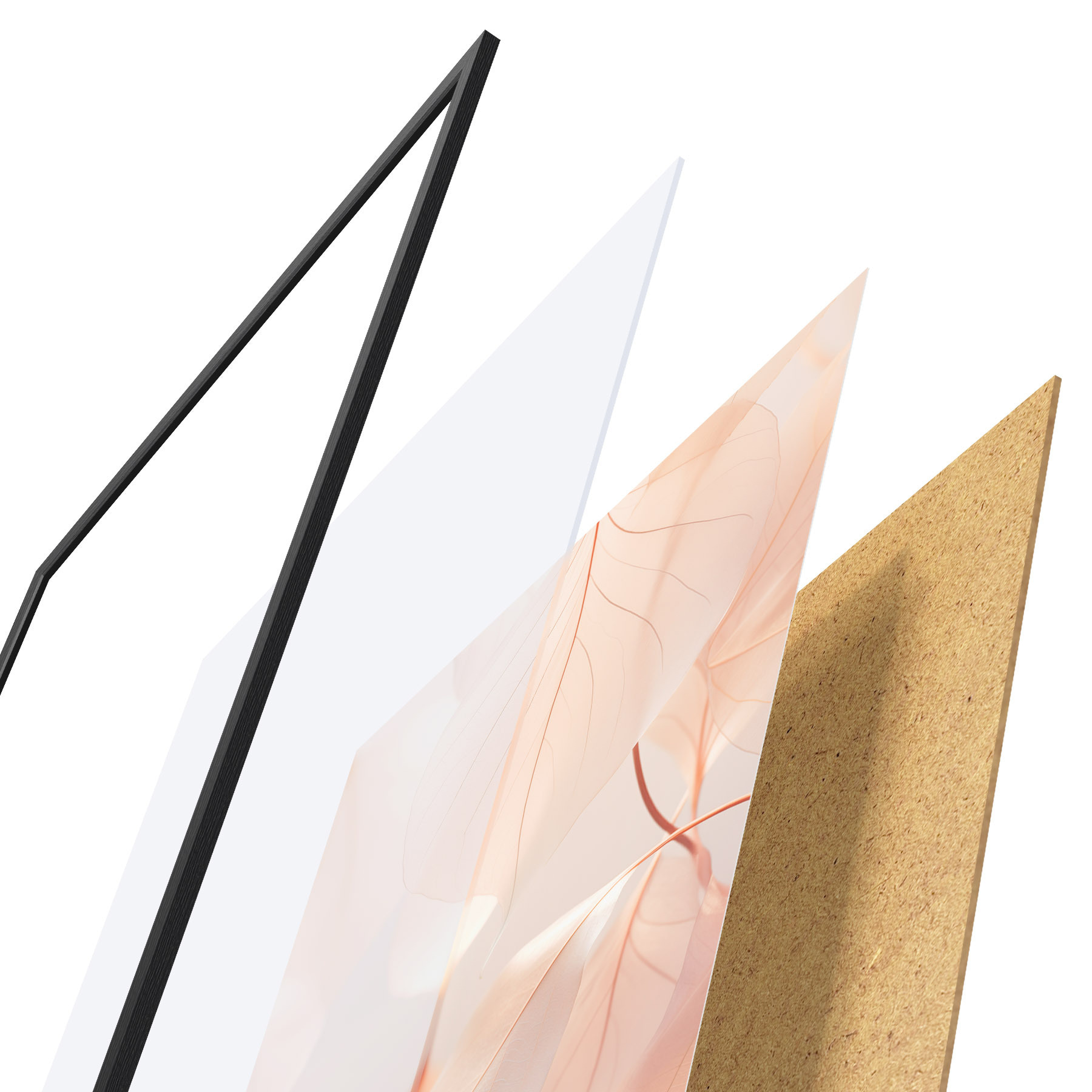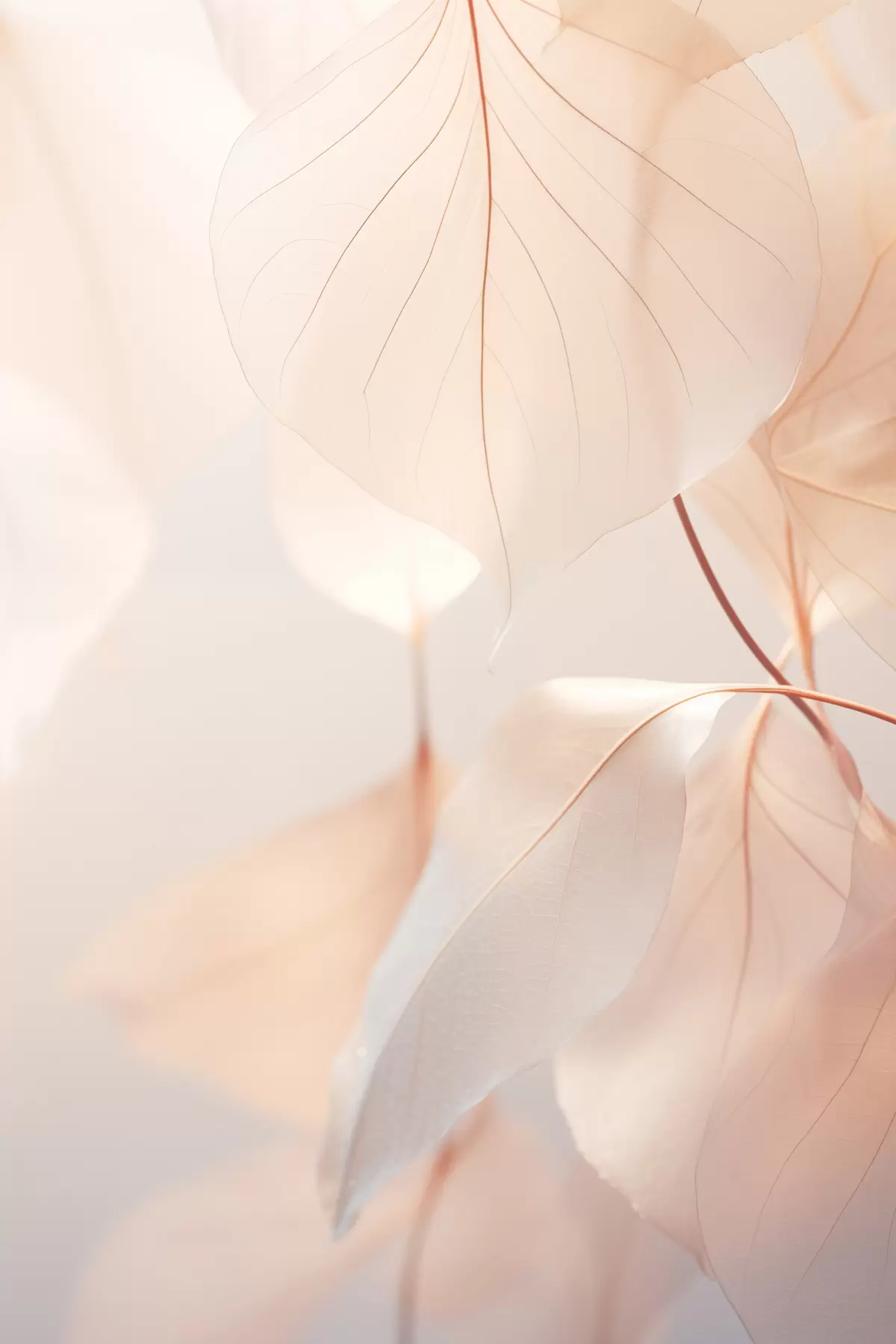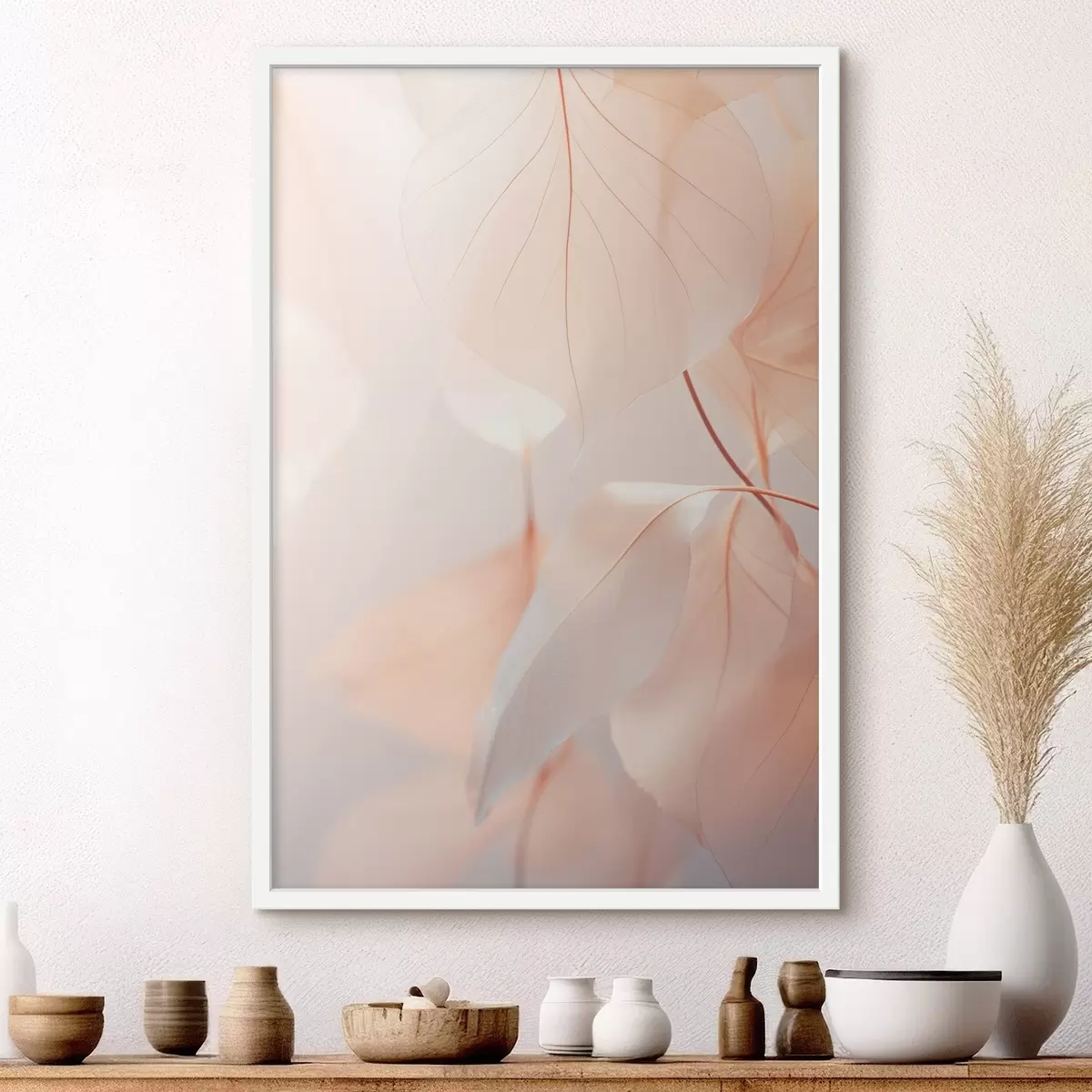 Plakatas Permatomų lapų su švelniomis gyslomis stambiu planu, švelni persikų ir balta spalvų paletė, neryškus fonas f45556