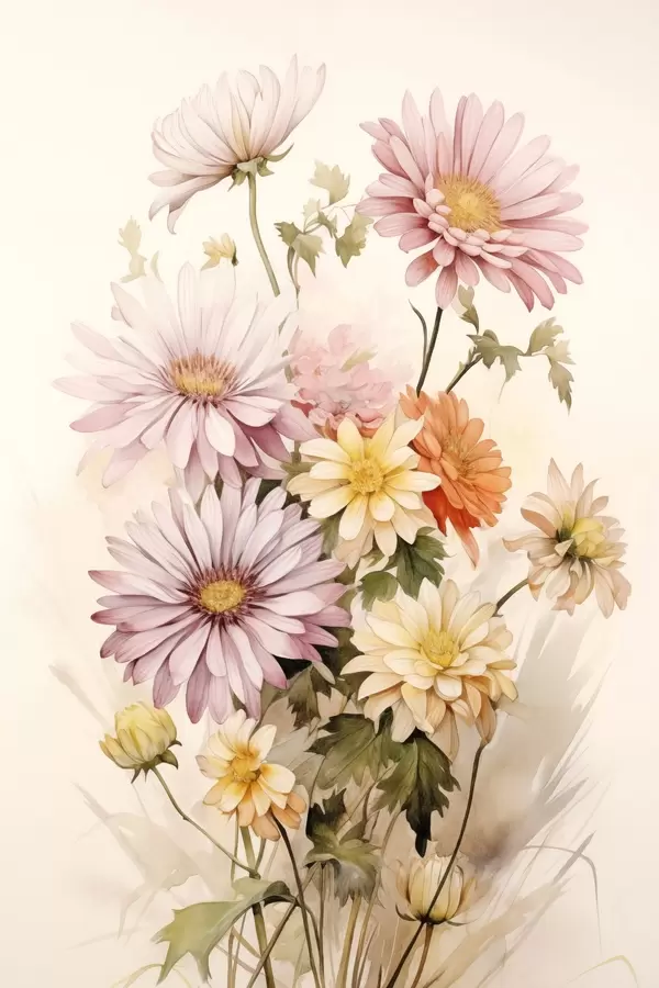 Plakatas Spalvingų gėlių puokštė, švelnus akvarelės stilius, šviesiame fone f45559