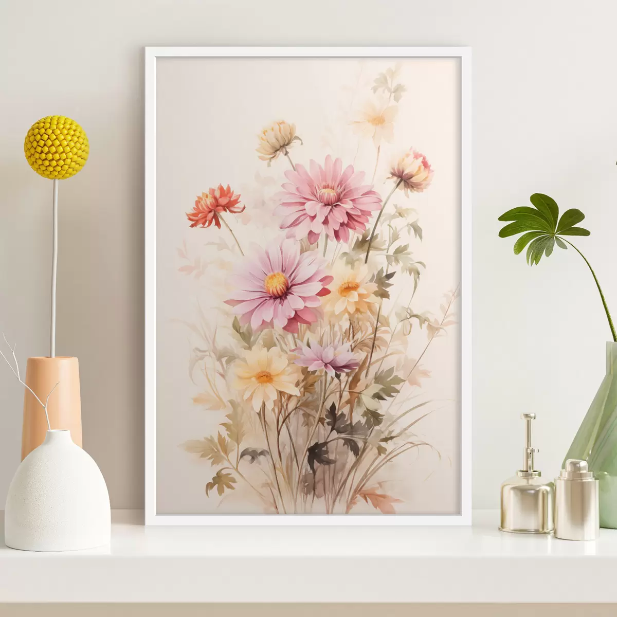 Plakatas Spalvingų gėlių puokštė, švelnus akvarelės stilius, šviesiame fone, botaninė iliustracija f45560