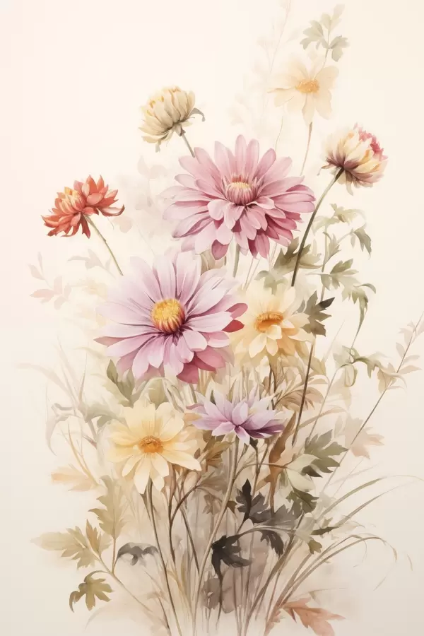 Plakatas Spalvingų gėlių puokštė, švelnus akvarelės stilius, šviesiame fone, botaninė iliustracija f45560