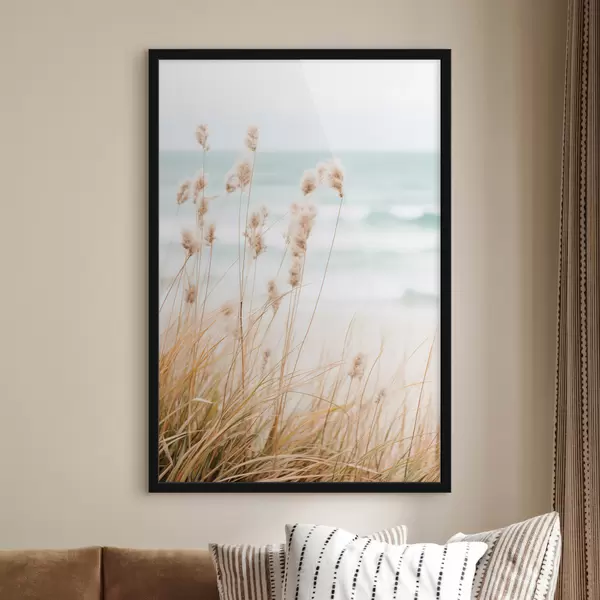Plakatas Aukšta žolė su pūkuotomis sėklų galvutėmis, smėlio paplūdimys ir vandenyno bangos fone, švelni ir prislopinta spalvų paletė f45561