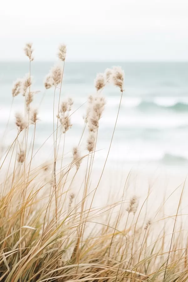 Plakatas Aukšta žolė su pūkuotomis sėklų galvutėmis, smėlio paplūdimys ir vandenyno bangos fone, švelni ir prislopinta spalvų paletė f45561