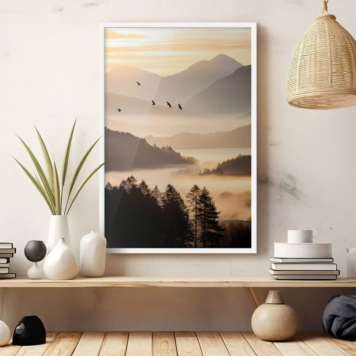 Plakatas Kalnų kraštovaizdis su mišku ir danguje skrendančiais paukščiais, visa tai dengia storas rūko sluoksnis saulėtekio metu f45564