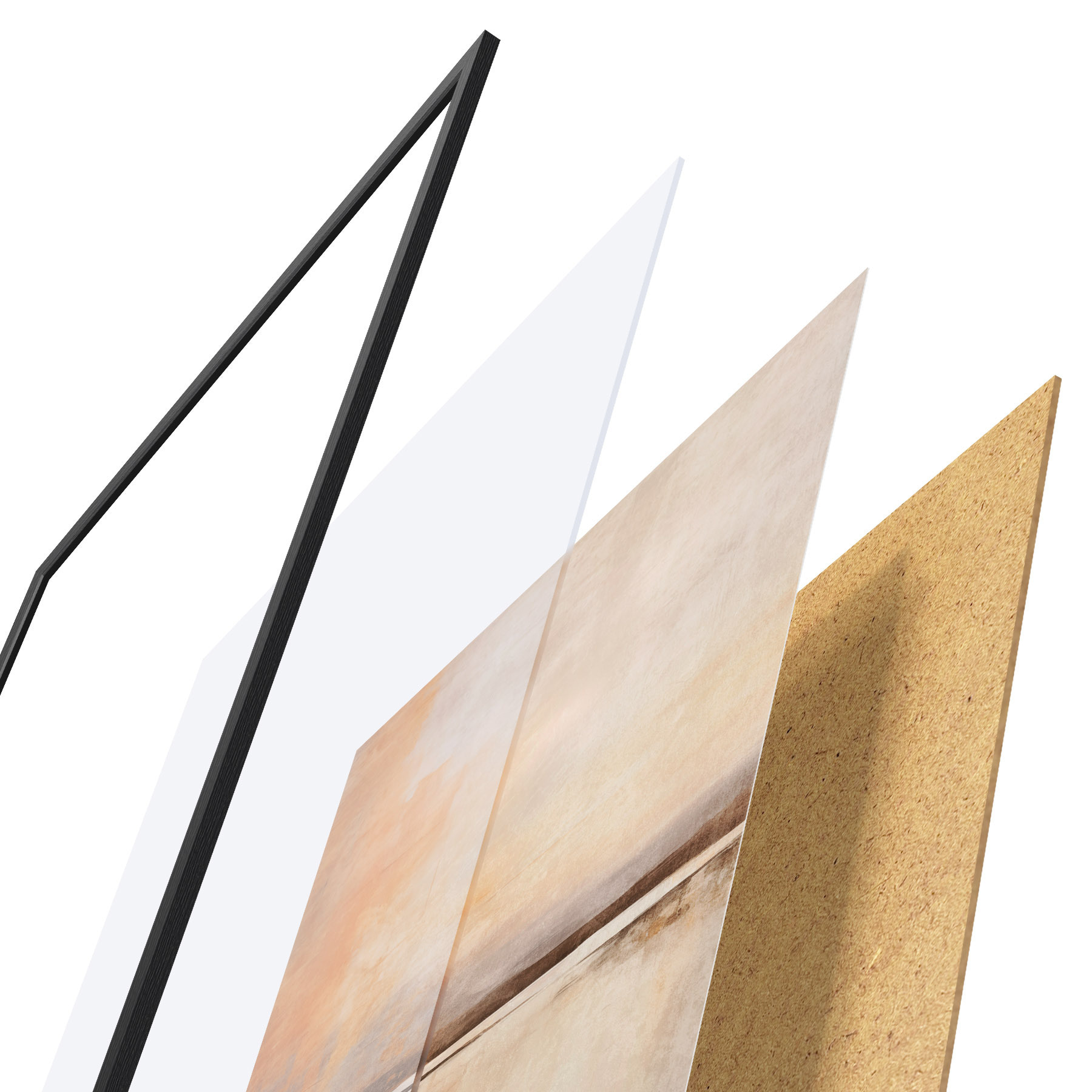 Plakatą sudaro rėmas, pleksiklas, atspausdintas vaizdas ir medžio drožlių plokštės pagrindas. Plakatą galima iš karto pakabinti ant sienos dėl kitoje pusėje esančių laikiklių.