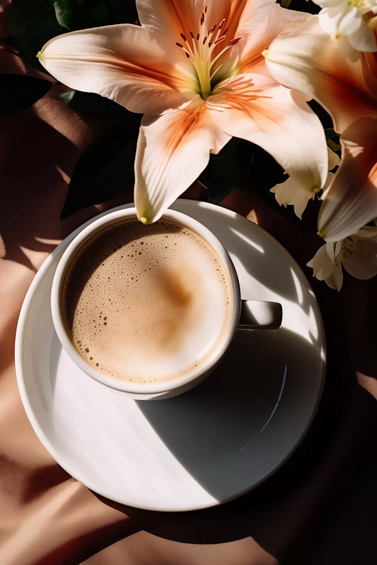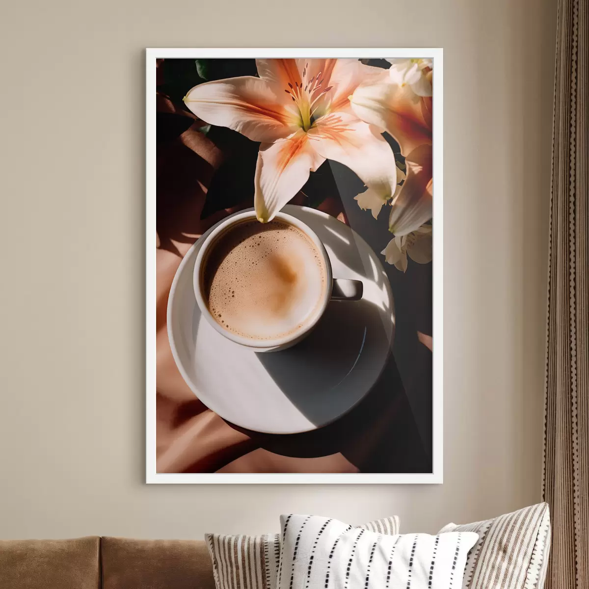 Plakatas Kavos puodelis su puta ant baltos lėkštės, gėlės fone, saulės šviesoje f45569