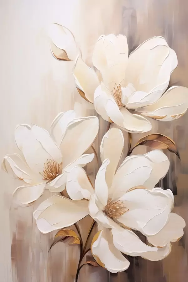 Plakatas Baltos magnolijos žiedai švelniame, neryškiame smėlio ir rudų tonų fone, elegantiška gėlių kompozicija f45571