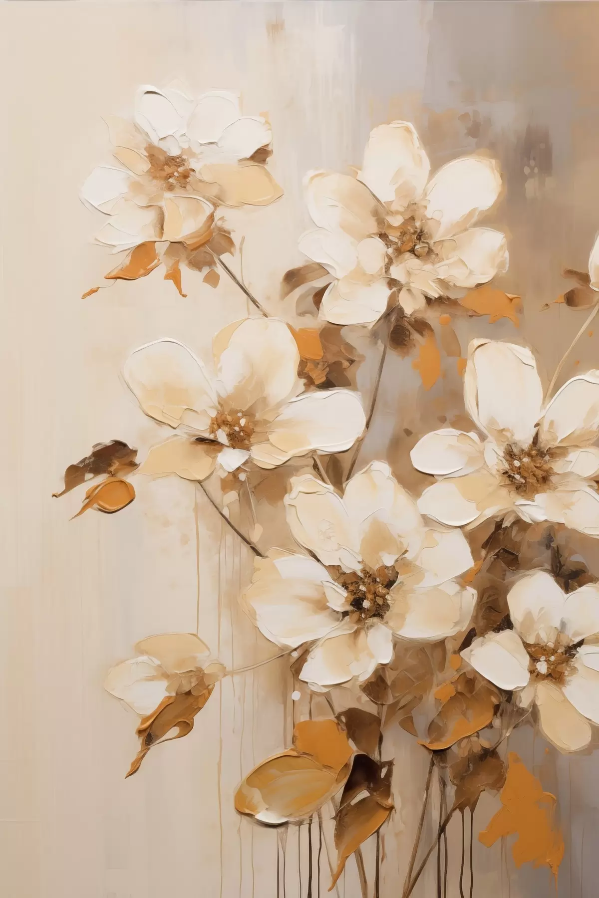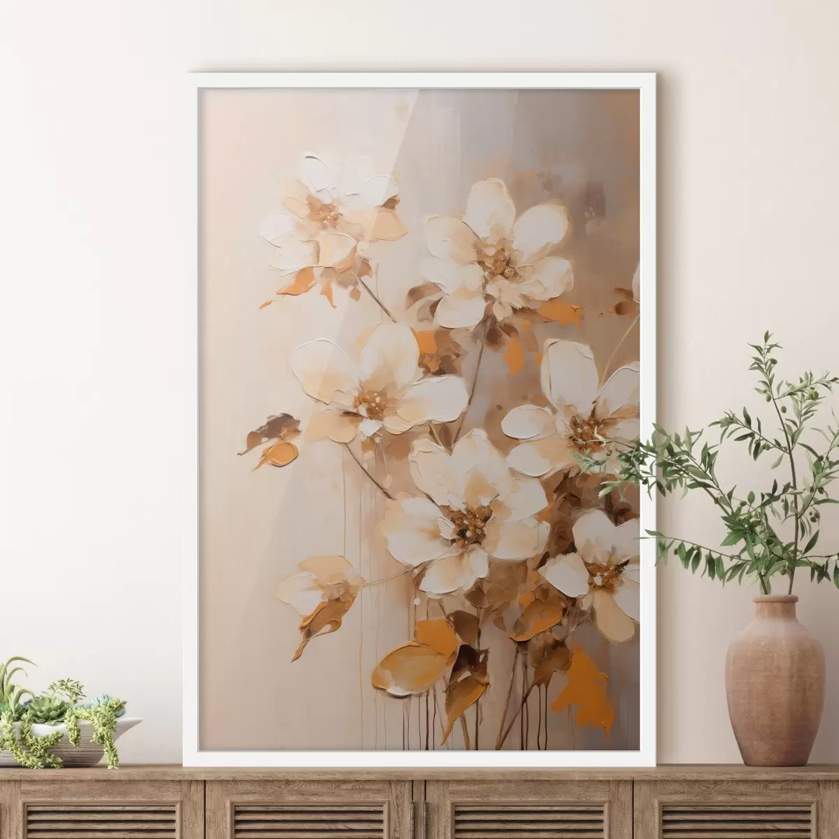 Plakatas Baltos gėlės su oranžiniais lapais, subtilūs potėpiai, gėlių kompozicija, botanikos menas f45574