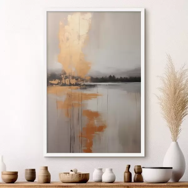 Plakatas Abstraktus kraštovaizdis su ežeru, medžiu ir geltonu rūku , vanduo atspindi debesuotą dangų f45575