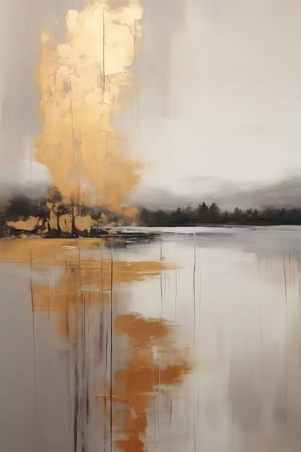 Plakatas Abstraktus kraštovaizdis su ežeru, medžiu ir geltonu rūku , vanduo atspindi debesuotą dangų f45575