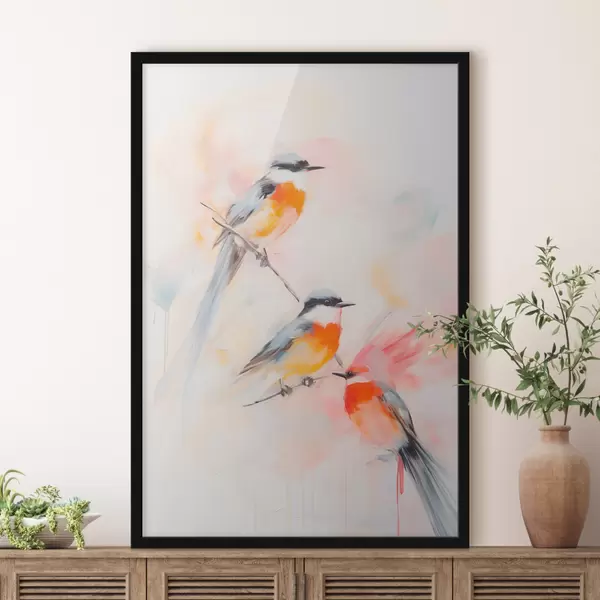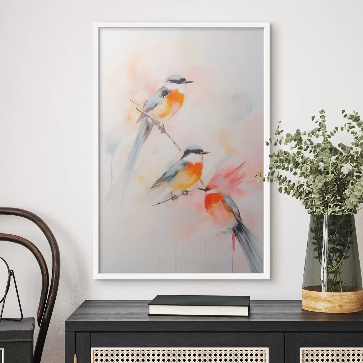 Plakatas Paukščiai ant šakų , švelnios pastelinės spalvos, šviesus rausvų ir baltų atspalvių fonas f45577