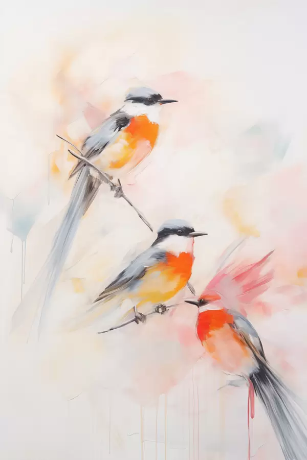 Plakatas Paukščiai ant šakų , švelnios pastelinės spalvos, šviesus rausvų ir baltų atspalvių fonas f45577