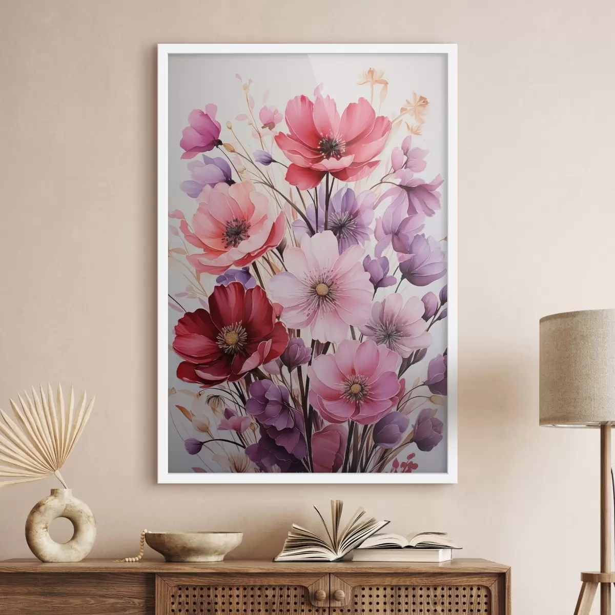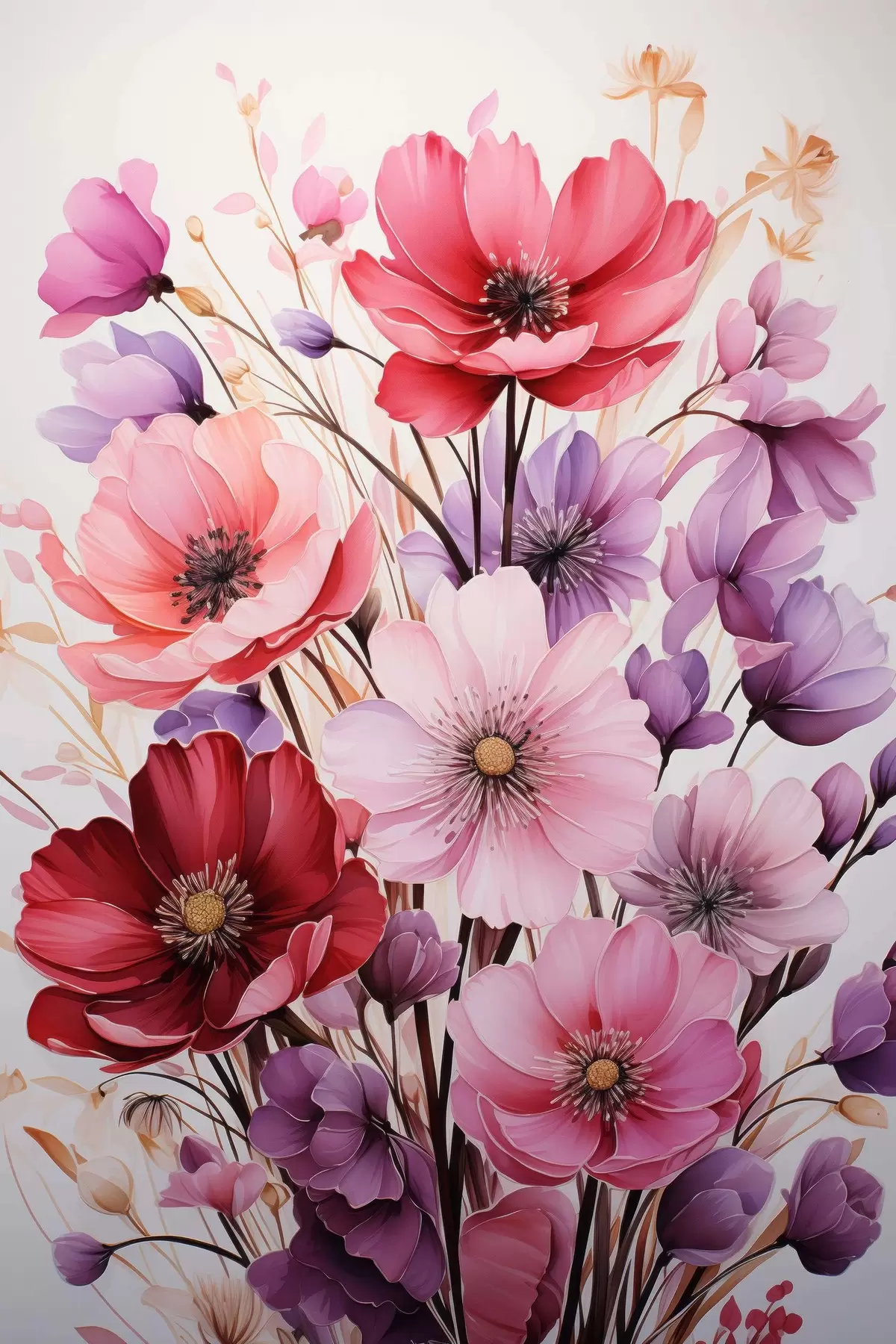 Plakatas Švelni rausvų ir alyvinių aguonų puokštė šviesiame fone, akvarelės stilius Ne f45601