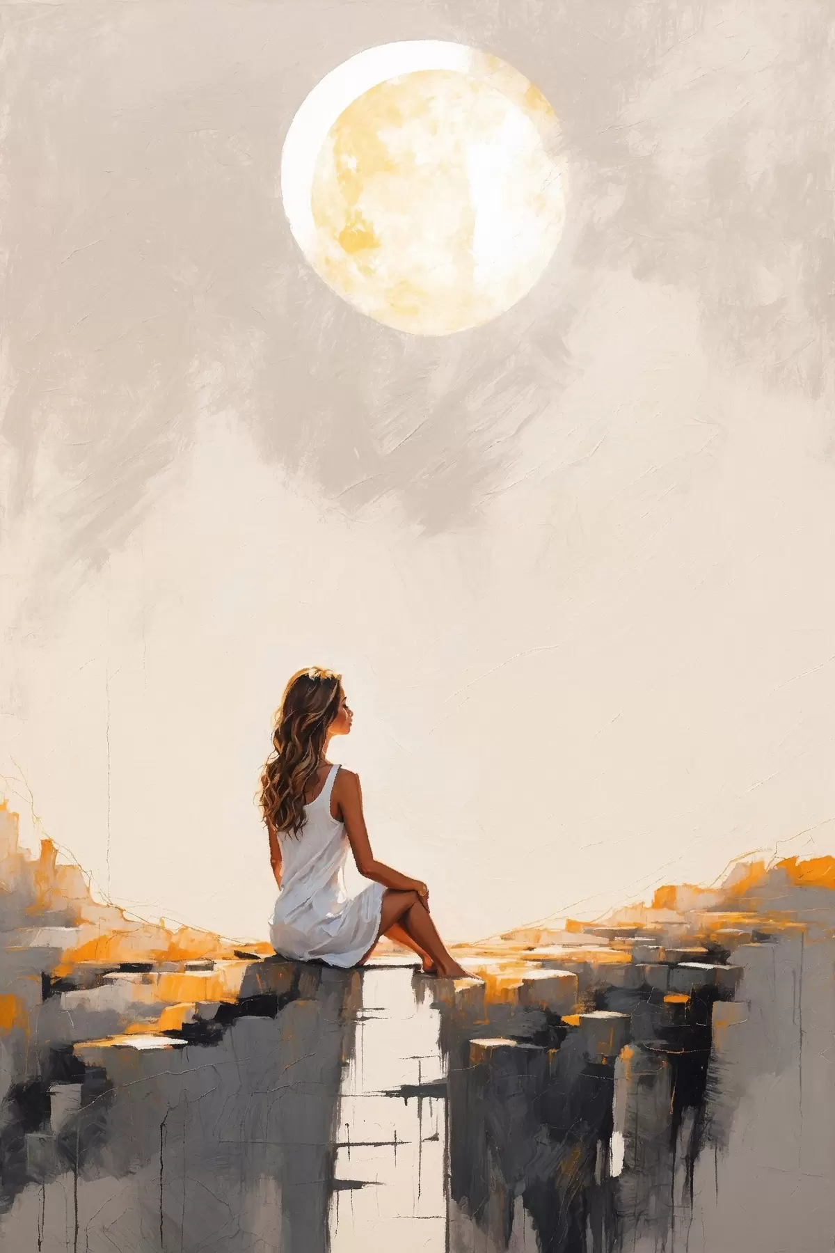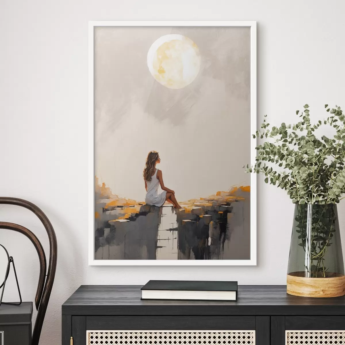 Plakatas Mergina balta suknele sėdi po dideliu mėnuliu f45621