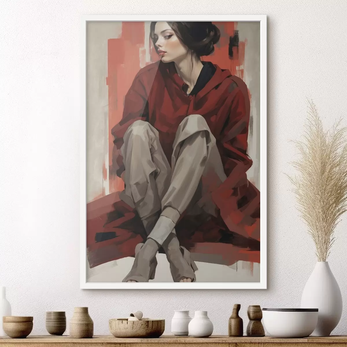 Plakatas Mergina raudonu apsiaustu, sėdinti sulenktomis kojomis f45624
