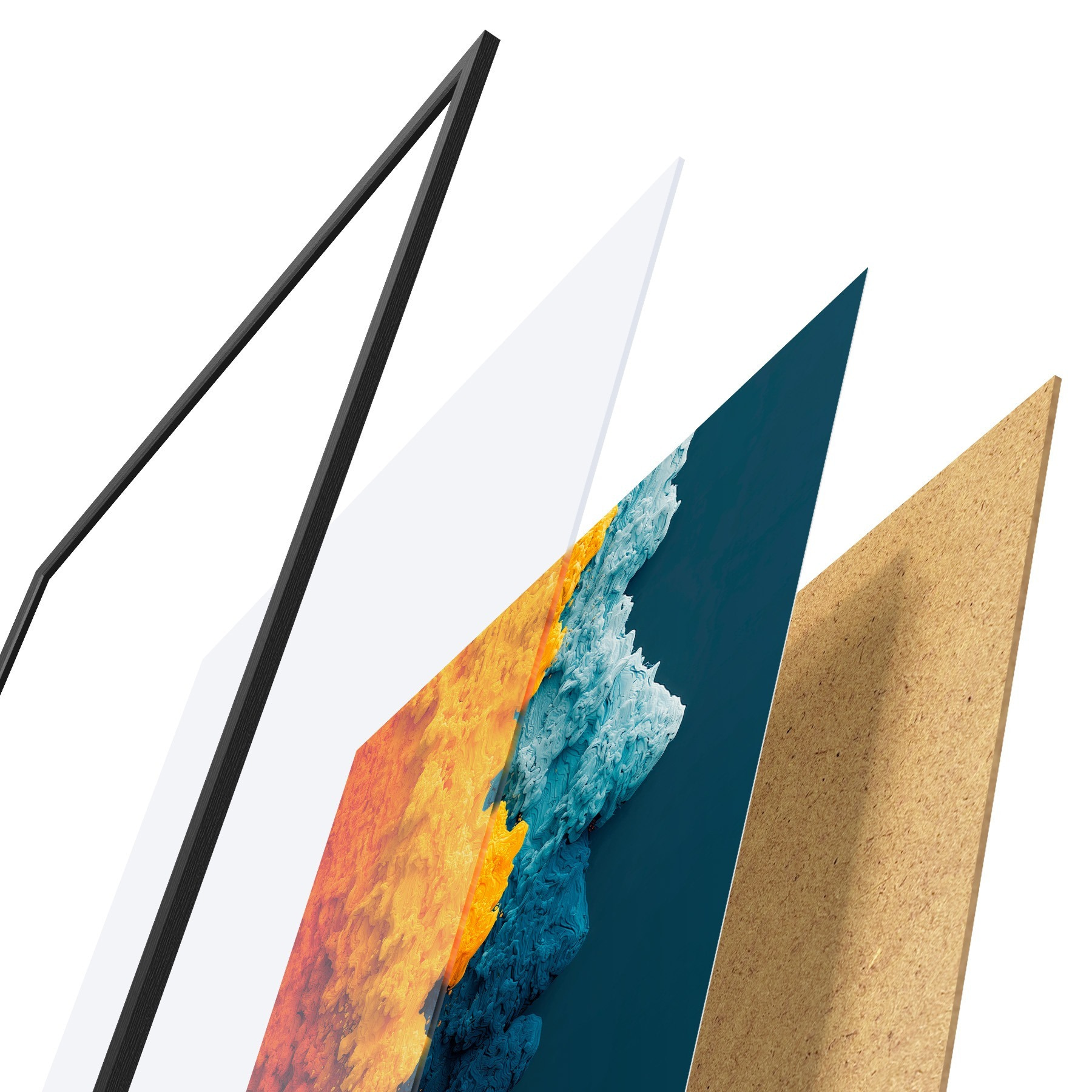Plakatą sudaro rėmas, pleksiklas, atspausdintas vaizdas ir medžio drožlių plokštės pagrindas. Plakatą galima iš karto pakabinti ant sienos dėl kitoje pusėje esančių laikiklių.
