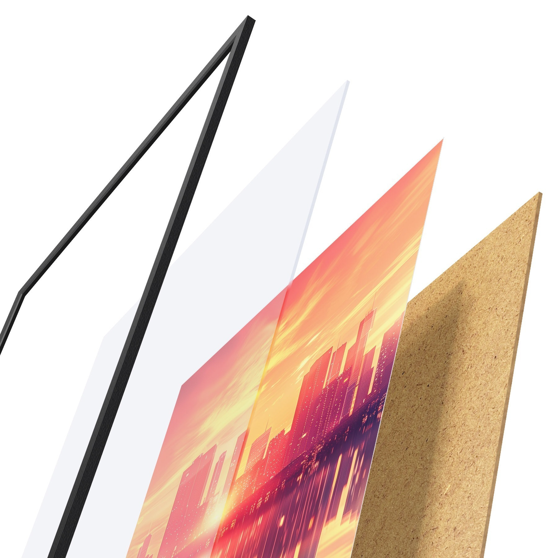 Plakatą sudaro rėmas, pleksiklas, atspausdintas vaizdas ir medžio drožlių plokštės pagrindas. Plakatą galima iš karto pakabinti ant sienos dėl kitoje pusėje esančių laikiklių.