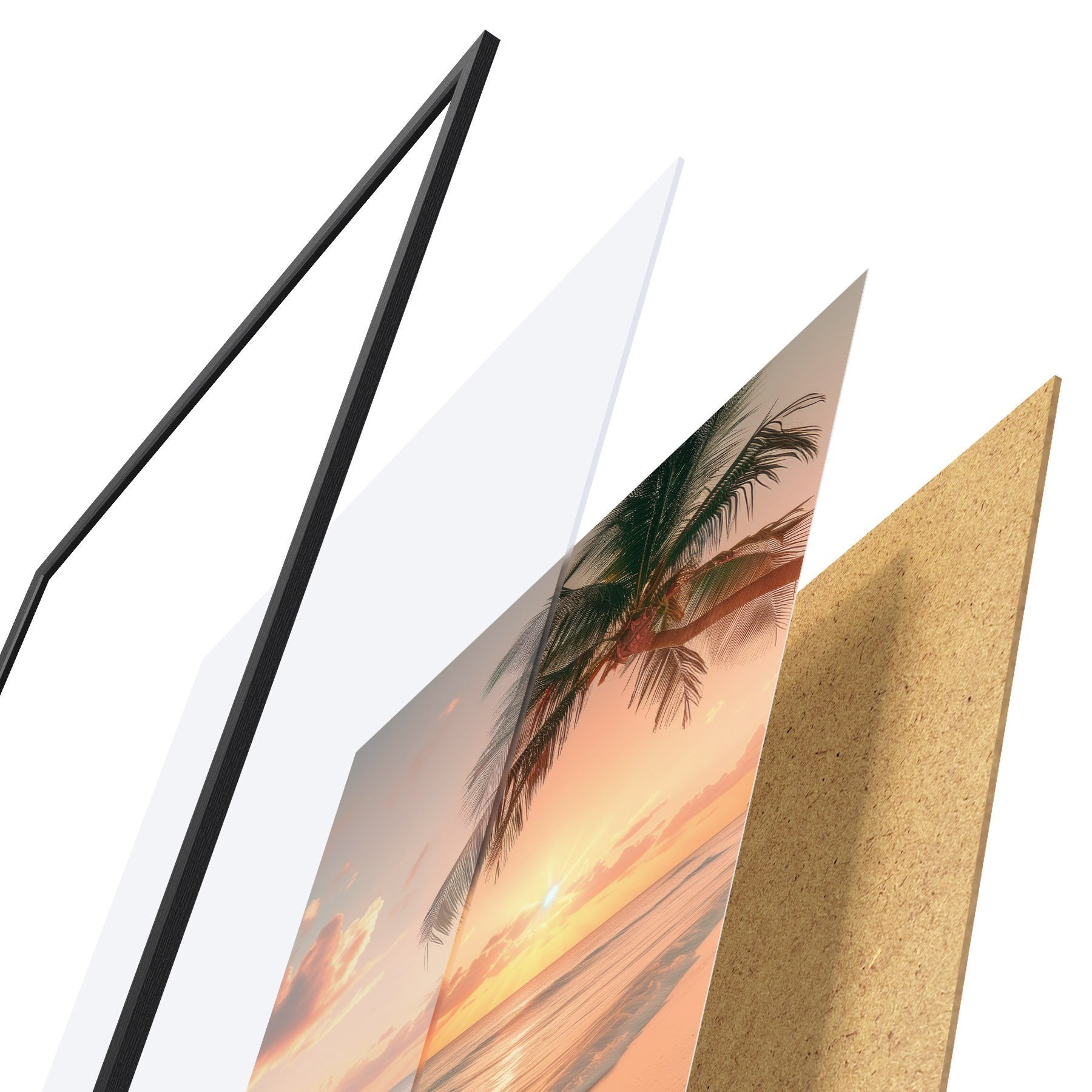 Plakatą sudaro rėmas, pleksiklas, atspausdintas vaizdas ir medžio drožlių plokštės pagrindas. Plakatą galima iš karto pakabinti ant sienos dėl kitoje pusėje esančių laikiklių.