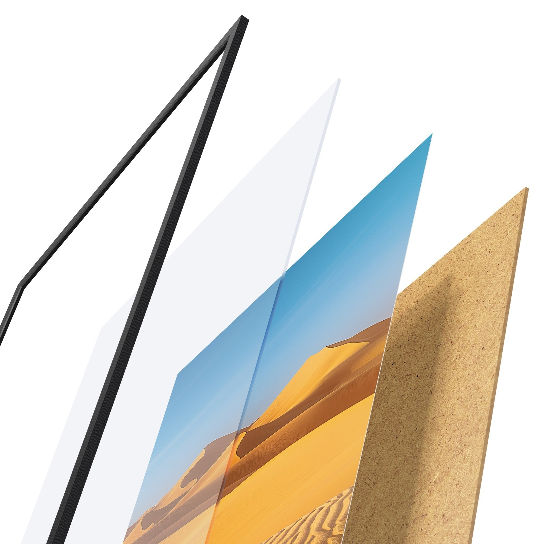 Plakatą sudaro rėmas, pleksiklas, atspausdintas vaizdas ir medžio drožlių plokštės pagrindas. Plakatą galima iš karto pakabinti ant sienos dėl kitoje pusėje esančių laikiklių.