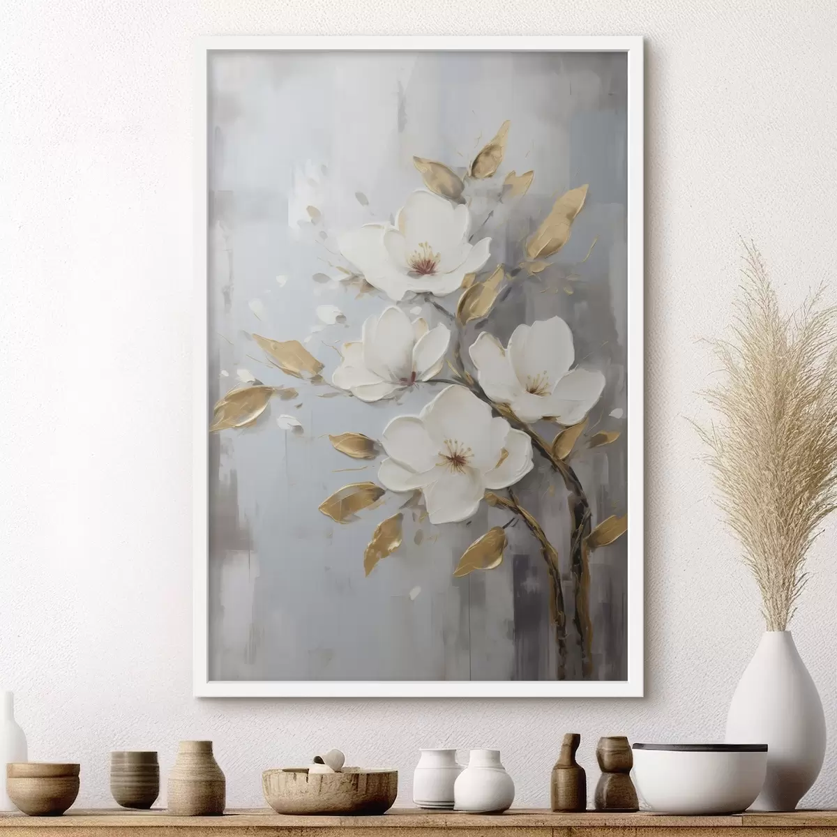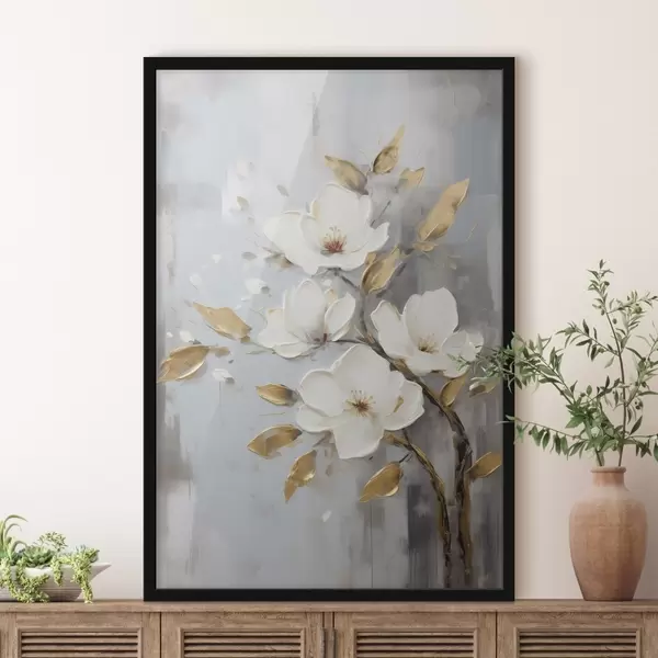 Plakatas Šaka su baltais žiedais ir geltonai oranžiniais lapais f45692