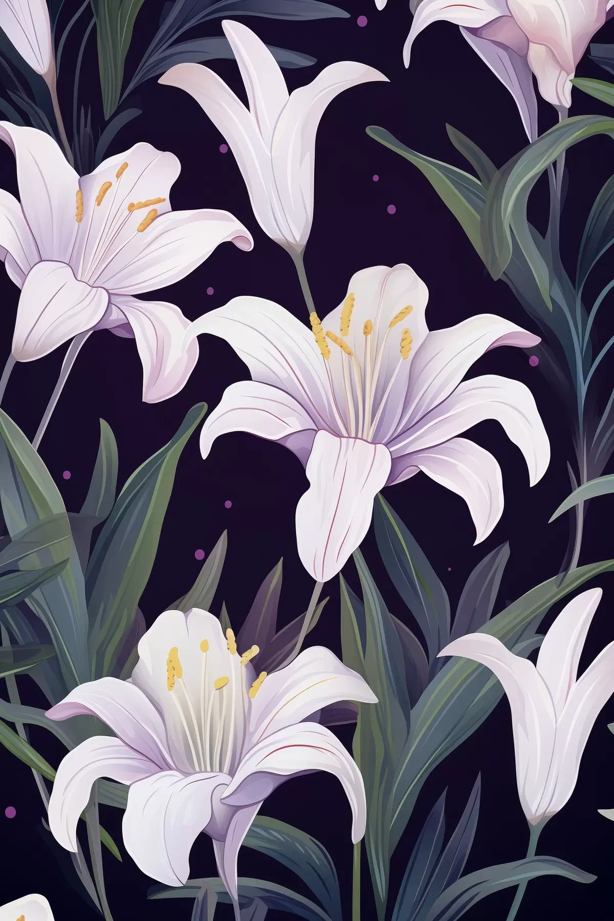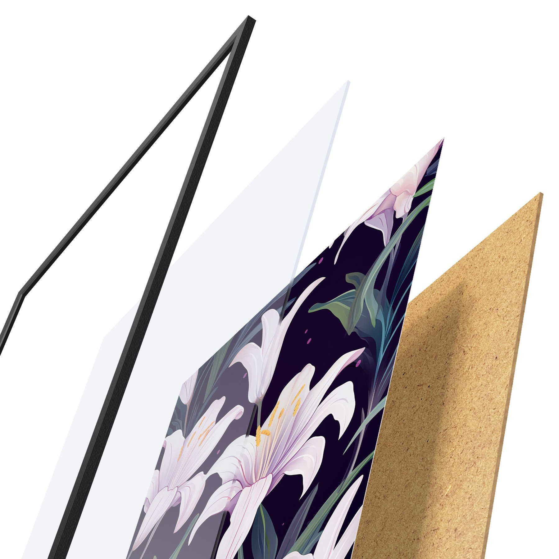 Plakatas Švelnios lelijos tamsiame fone su žaliais lapais f45697