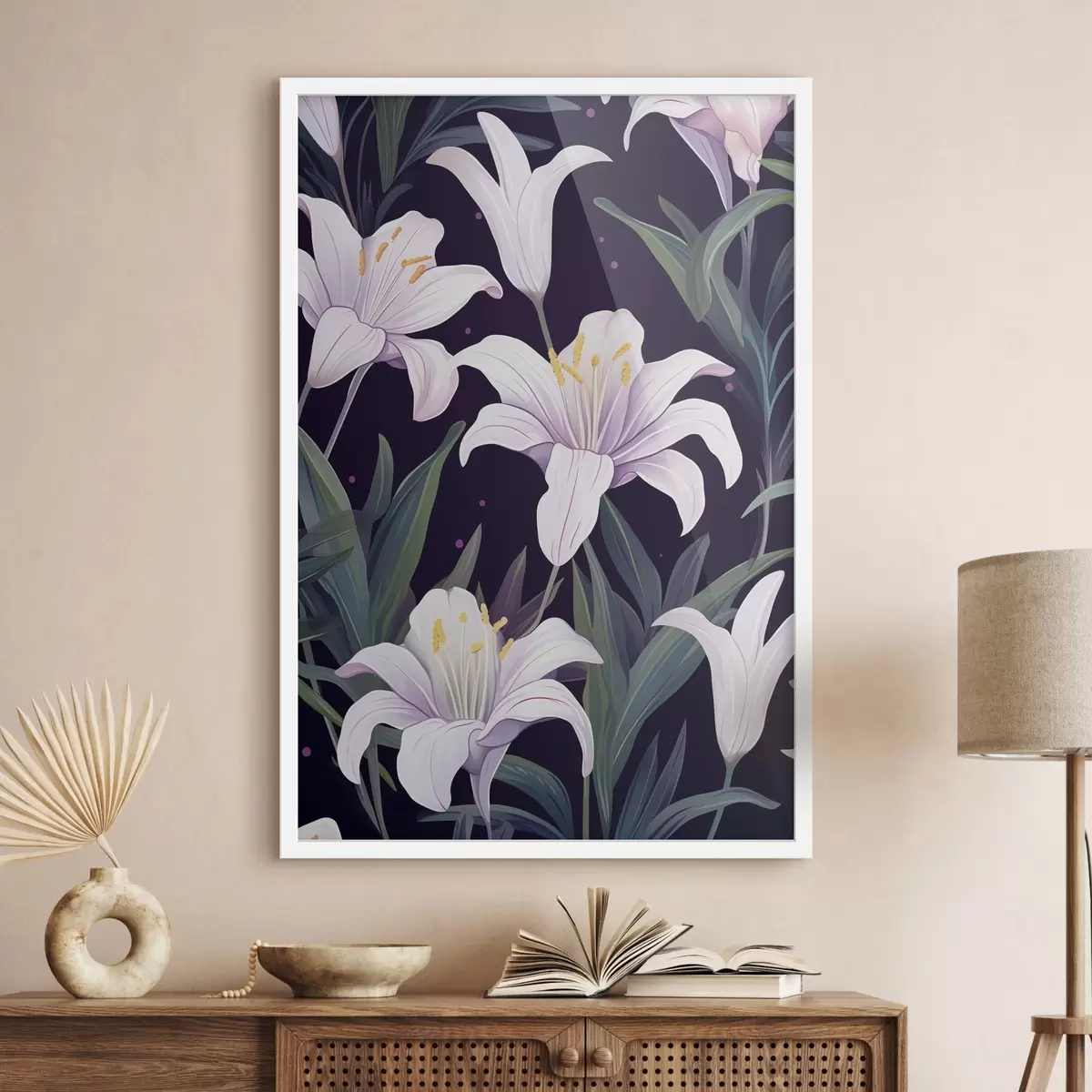 Plakatas Švelnios lelijos tamsiame fone su žaliais lapais Ne f45697