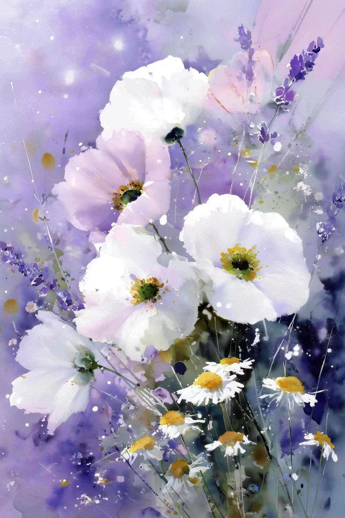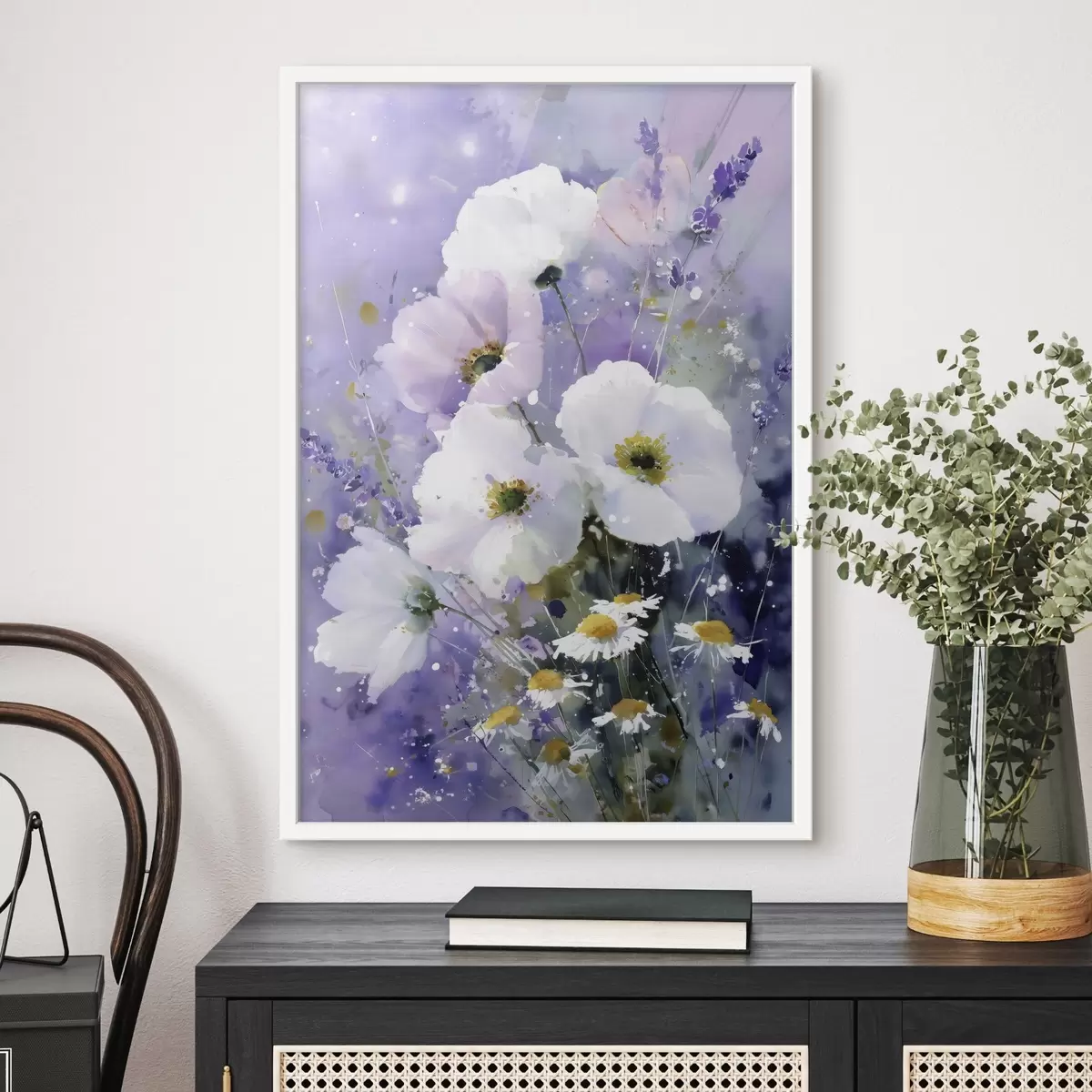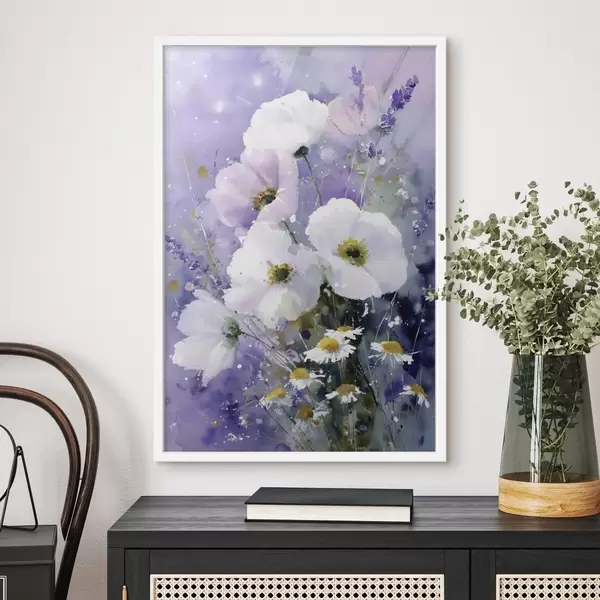 Plakatas akvarelinis puokštė alyvinės ir baltos spalvos tonais f45719