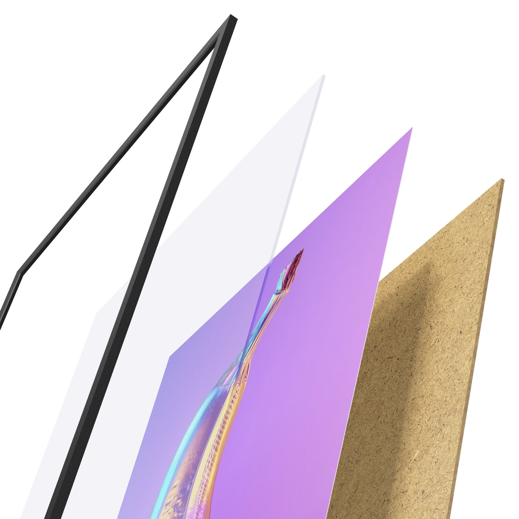 Plakatą sudaro rėmas, pleksiklas, atspausdintas vaizdas ir medžio drožlių plokštės pagrindas. Plakatą galima iš karto pakabinti ant sienos dėl kitoje pusėje esančių laikiklių.