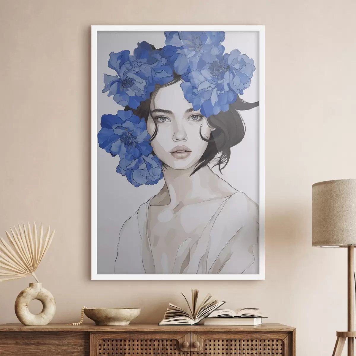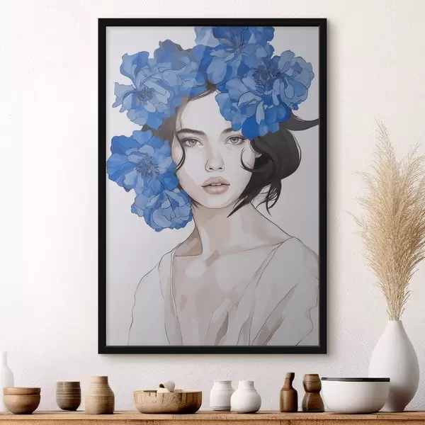 Plakatas Merginos su mėlynomis gėlėmis portretas f45756