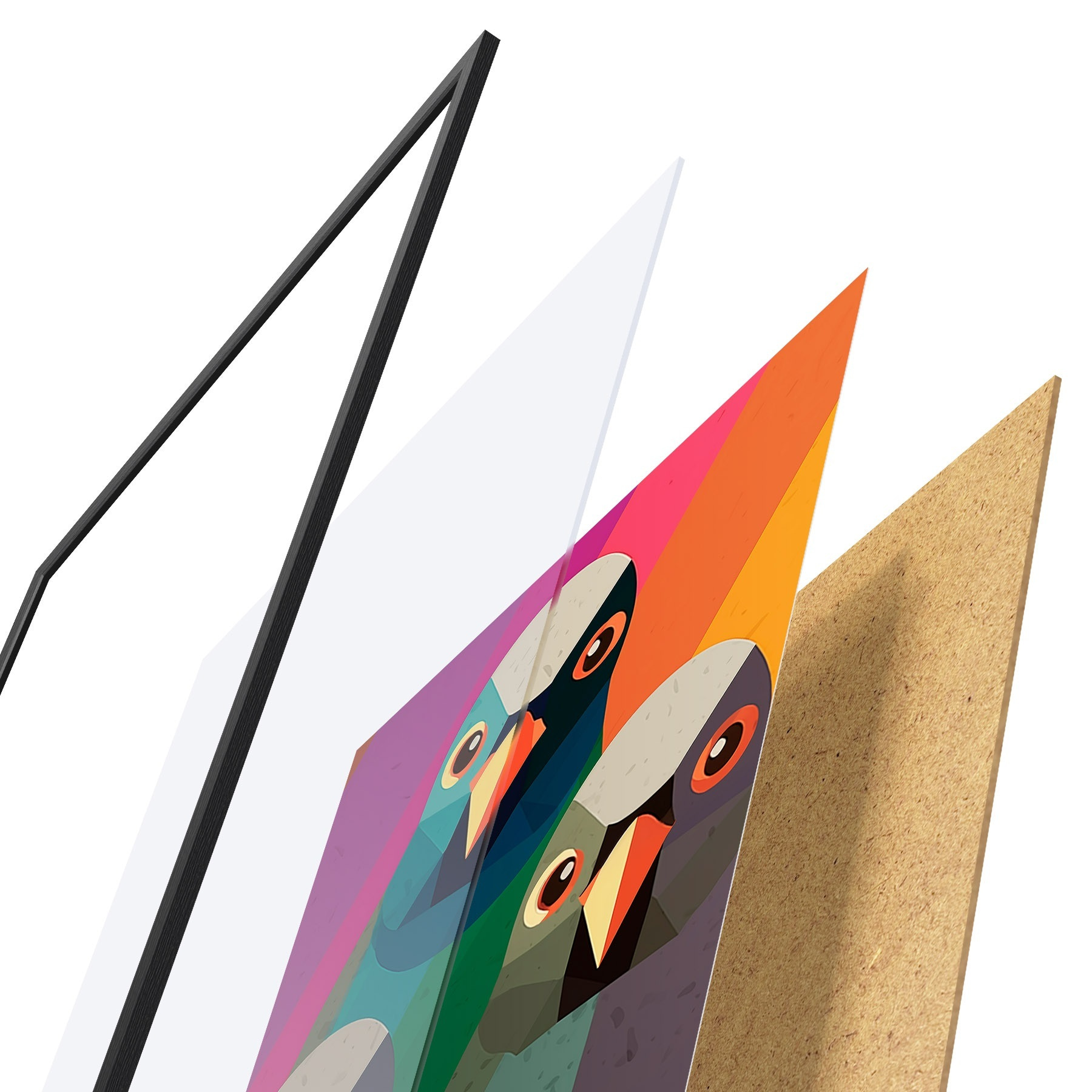 Plakatą sudaro rėmas, pleksiklas, atspausdintas vaizdas ir medžio drožlių plokštės pagrindas. Plakatą galima iš karto pakabinti ant sienos dėl kitoje pusėje esančių laikiklių.