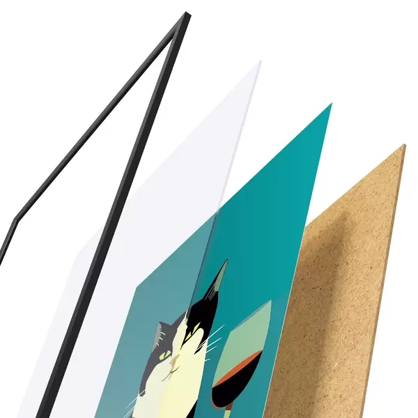 Plakatą sudaro rėmas, pleksiklas, atspausdintas vaizdas ir medžio drožlių plokštės pagrindas. Plakatą galima iš karto pakabinti ant sienos dėl kitoje pusėje esančių laikiklių.