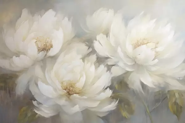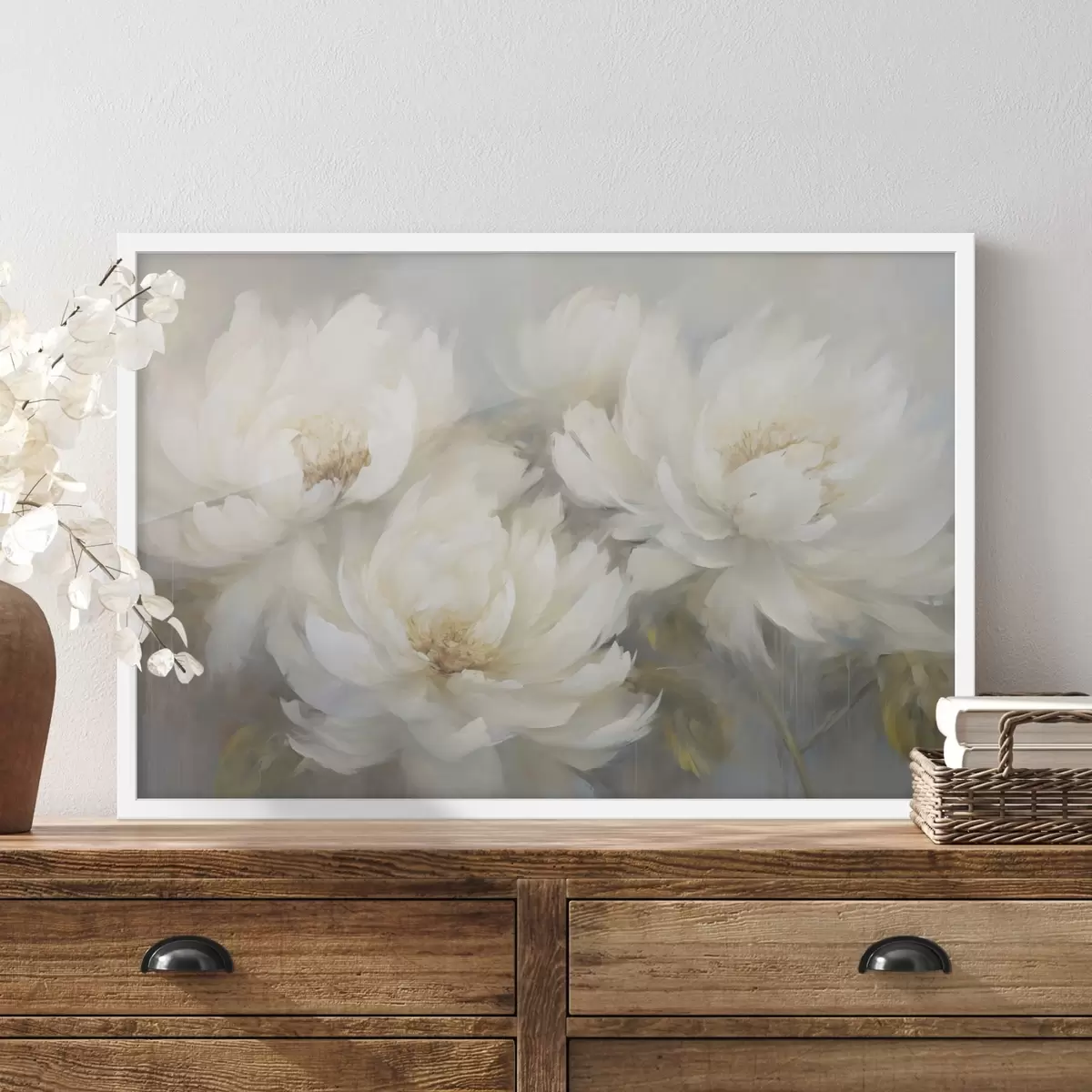 Plakatas Trys sodrios baltos bijūnės ant subtilaus fono f45808