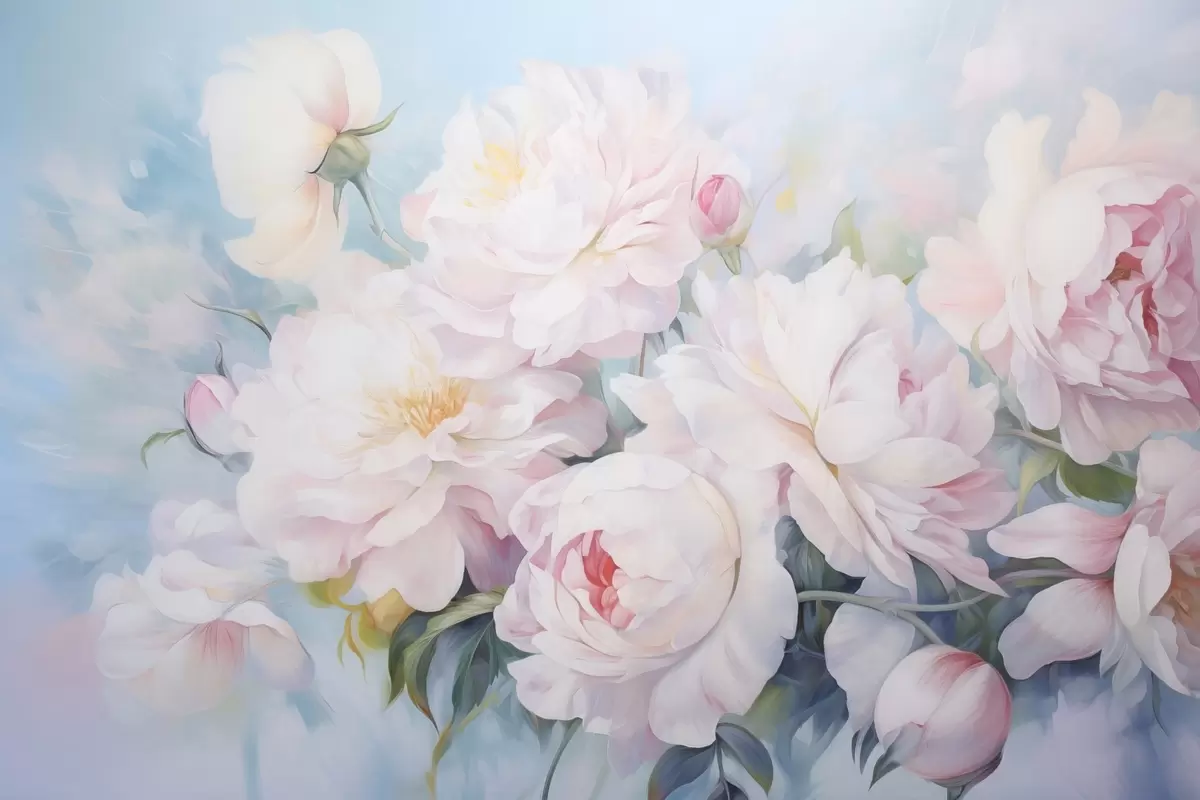 Plakatas Subtilūs rožiniai bijūnai ant žydro dangaus fono f45813