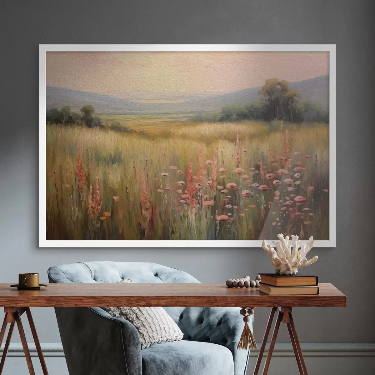 Plakatas Lauko peizažas su gėlėmis saulėlydžio metu f45818