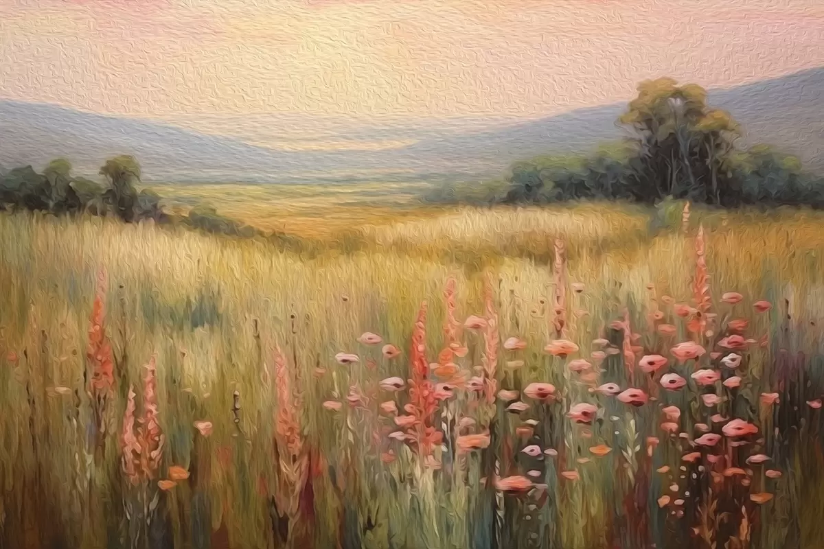 Plakatas Lauko peizažas su gėlėmis saulėlydžio metu Ne f45818