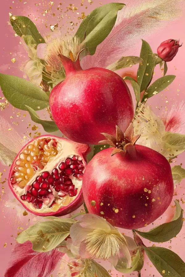 Plakatas Subrendę granatai ant rožinio fono su lapais ir dėmėmis f45868