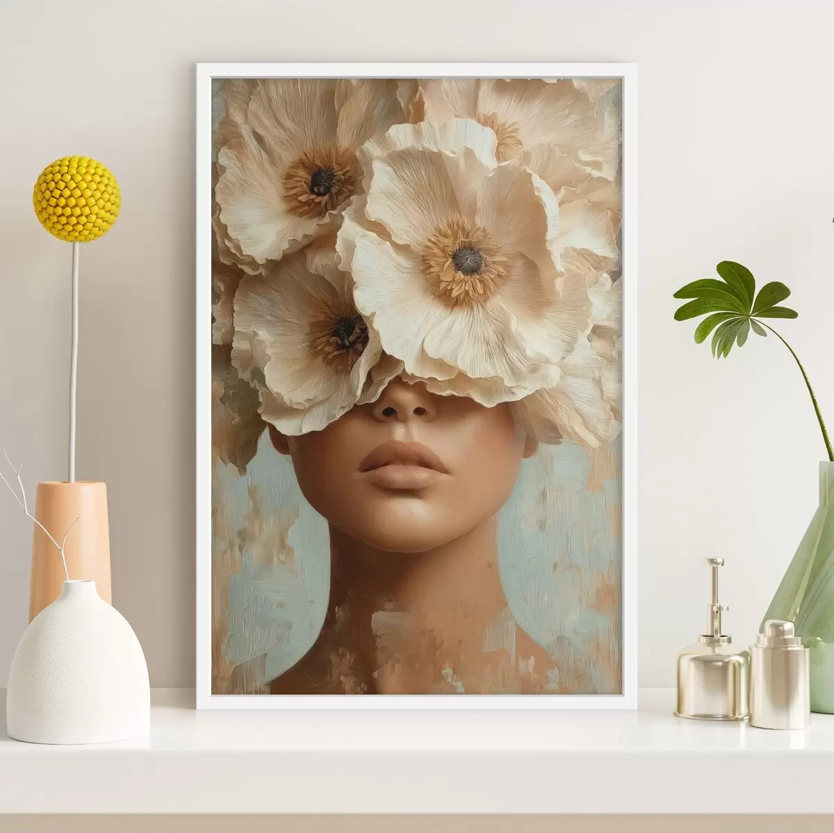 Plakatas Portretas su smėlio spalvos gėlėmis, dengiančiomis akis f45870