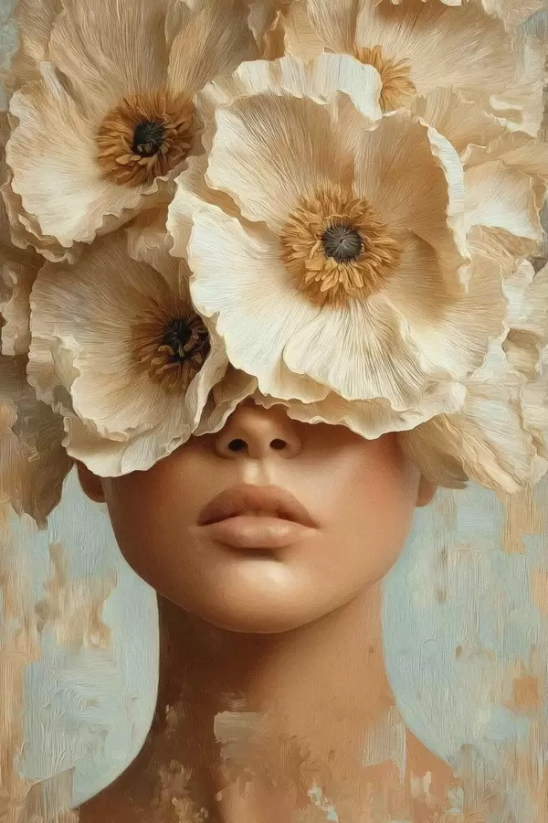 Plakatas Portretas su smėlio spalvos gėlėmis, dengiančiomis akis f45870