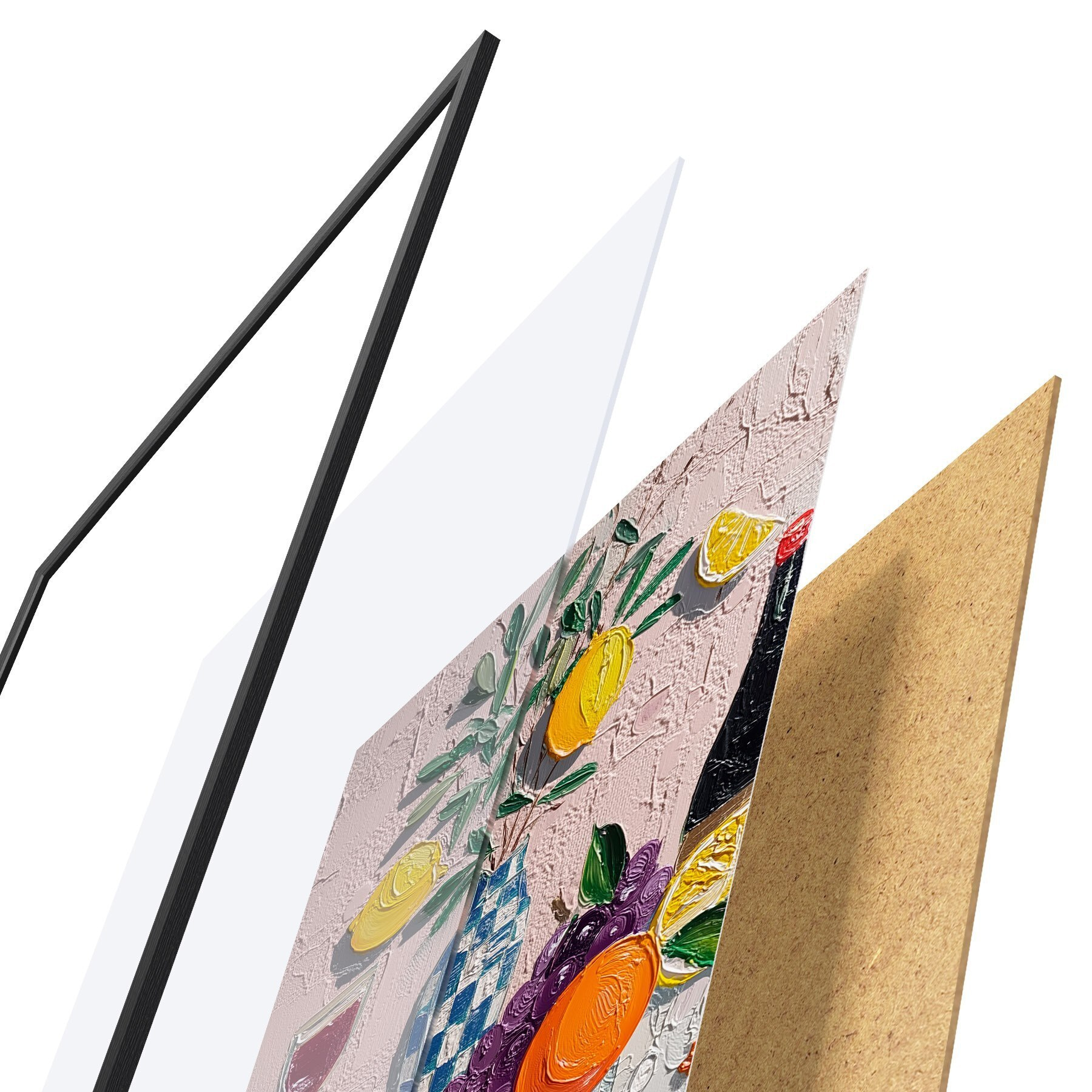 Plakatą sudaro rėmas, pleksiklas, atspausdintas vaizdas ir medžio drožlių plokštės pagrindas. Plakatą galima iš karto pakabinti ant sienos dėl kitoje pusėje esančių laikiklių.