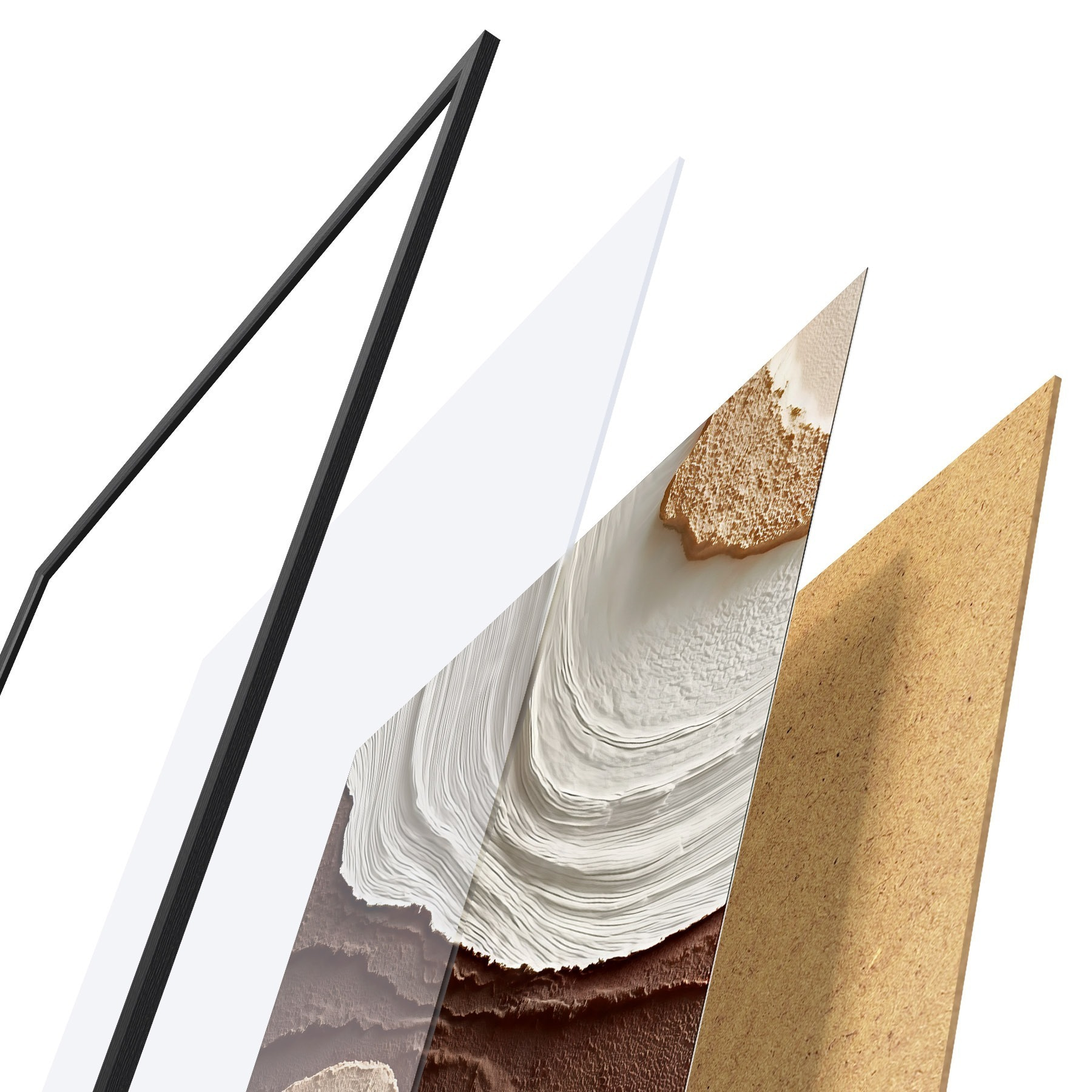 Plakatą sudaro rėmas, pleksiklas, atspausdintas vaizdas ir medžio drožlių plokštės pagrindas. Plakatą galima iš karto pakabinti ant sienos dėl kitoje pusėje esančių laikiklių.