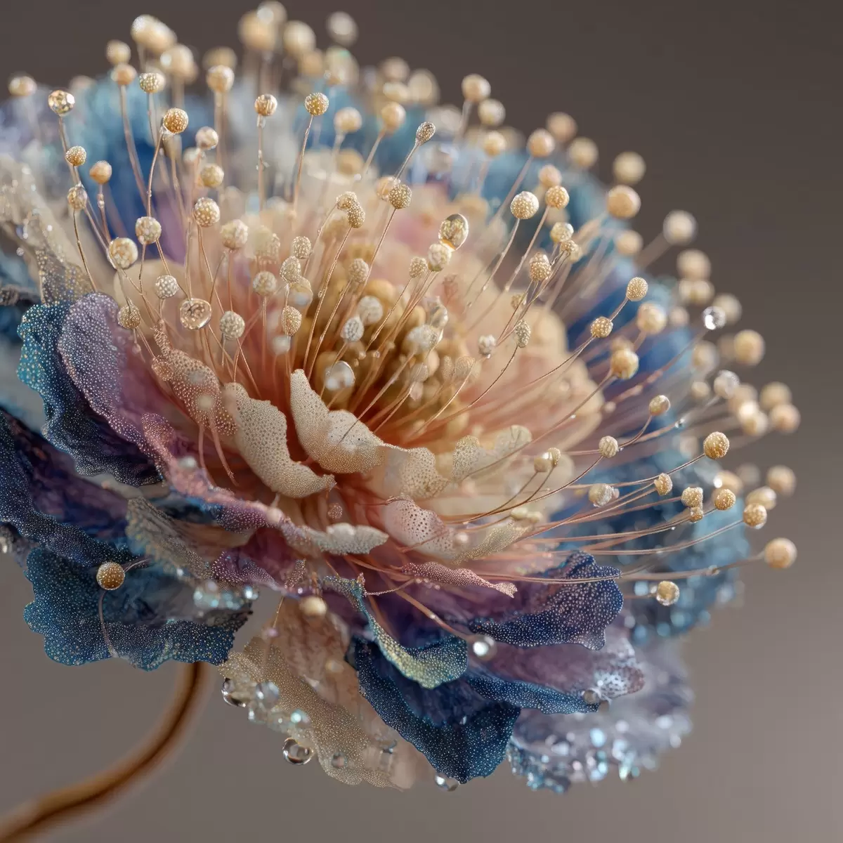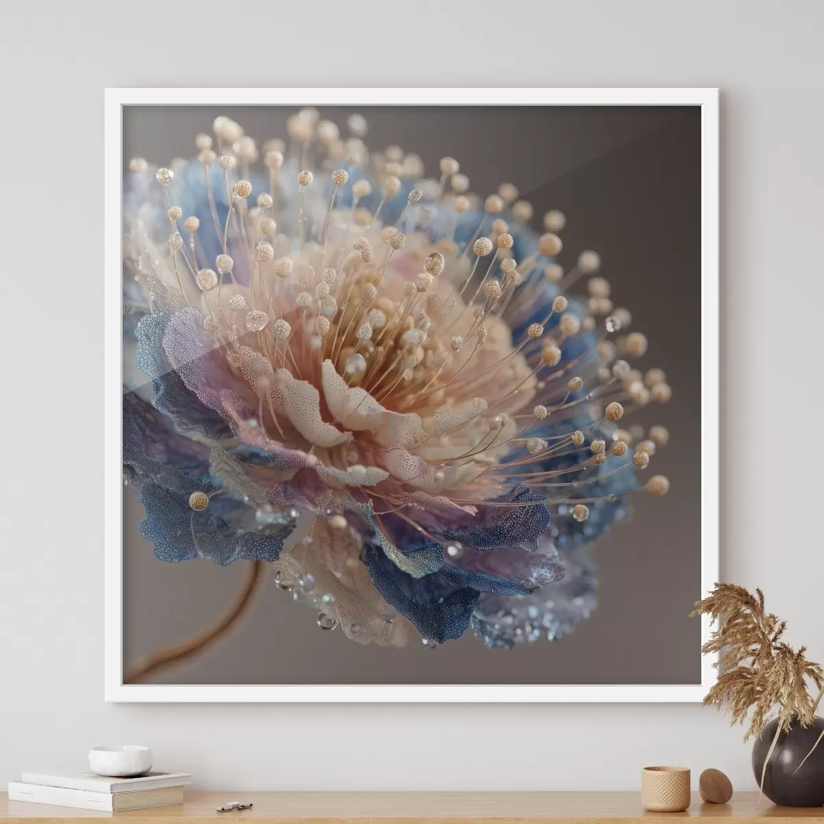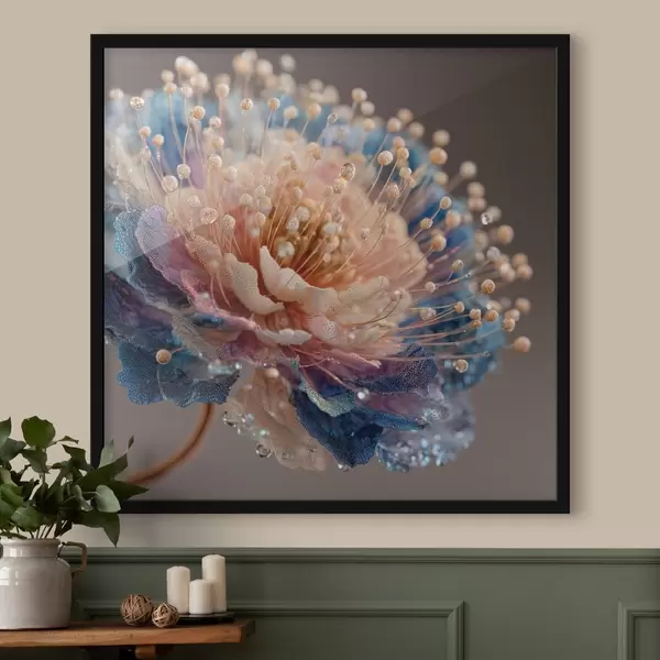 Plakatas Perlamutrinė gėlė su rasos lašeliais, persikų ir mėlynų spalvų žiedlapiais f45911