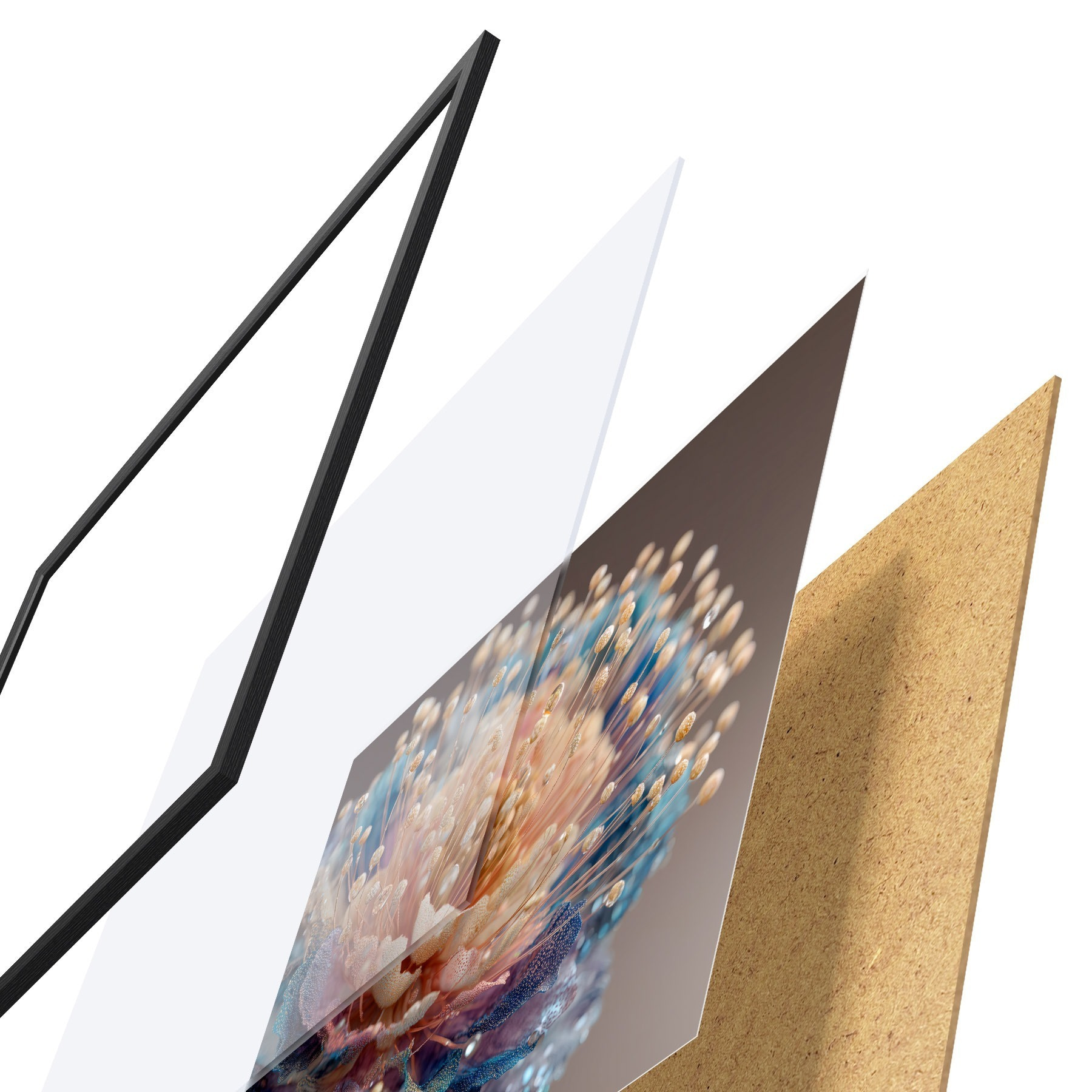 Plakatą sudaro rėmas, pleksiklas, atspausdintas vaizdas ir medžio drožlių plokštės pagrindas. Plakatą galima iš karto pakabinti ant sienos dėl kitoje pusėje esančių laikiklių.