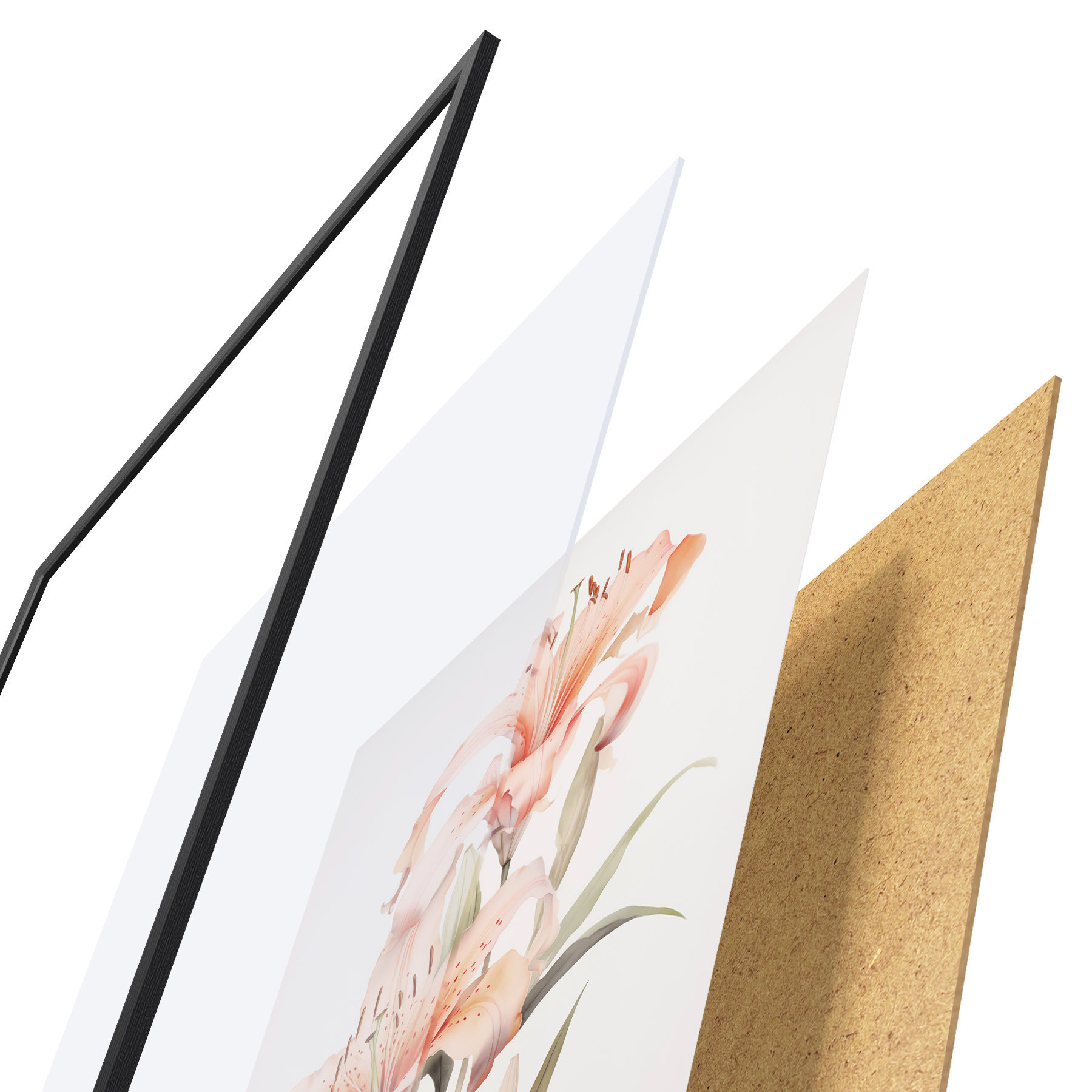 Plakatą sudaro rėmas, pleksiklas, atspausdintas vaizdas ir medžio drožlių plokštės pagrindas. Plakatą galima iš karto pakabinti ant sienos dėl kitoje pusėje esančių laikiklių.