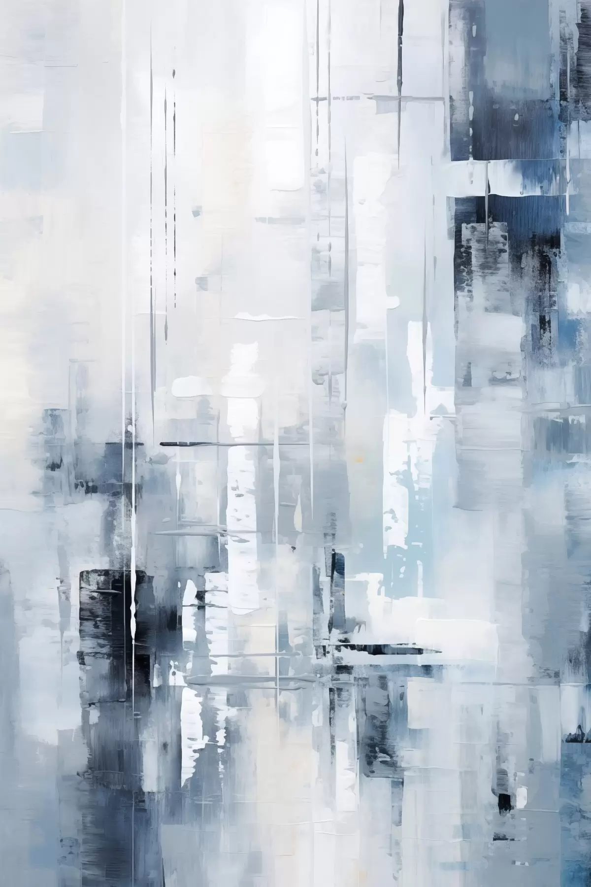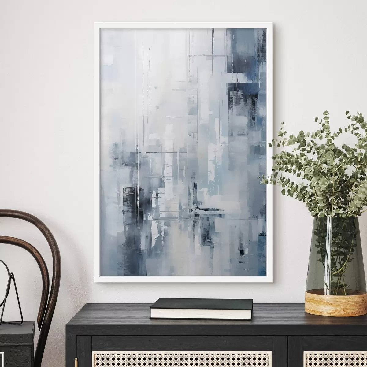 Plakatas Abstraktaus tapybos imitacija mėlyna, pilka ir balta spalvomis, vertikaliomis linijomis ir geometrinėmis formomis f45927