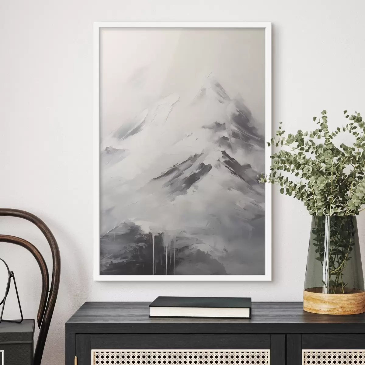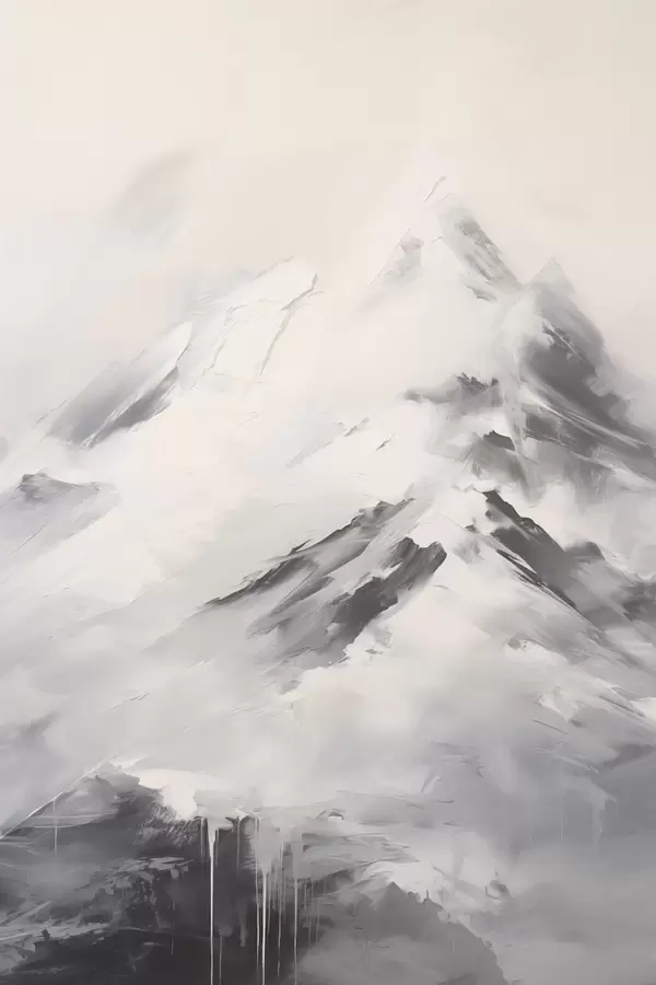 Plakatas Snieguotos kalnų viršūnės su pilkomis šešėlėmis, pilkas dangus, teptuko potėpiai, tekstūruotas, minimalistinis Ne f45932