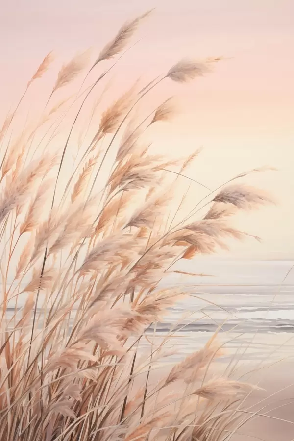Plakatas Pampų žolė su pastelinės oranžinės spalvos palete, šviesiai rožinis dangus, ramus kraštovaizdis f45934
