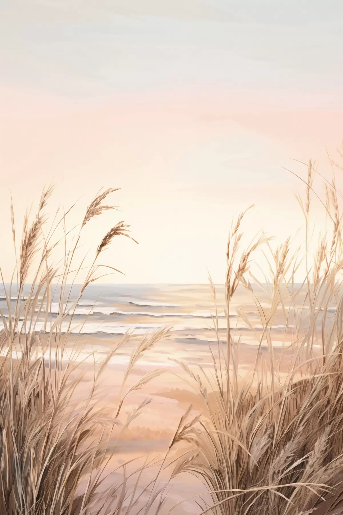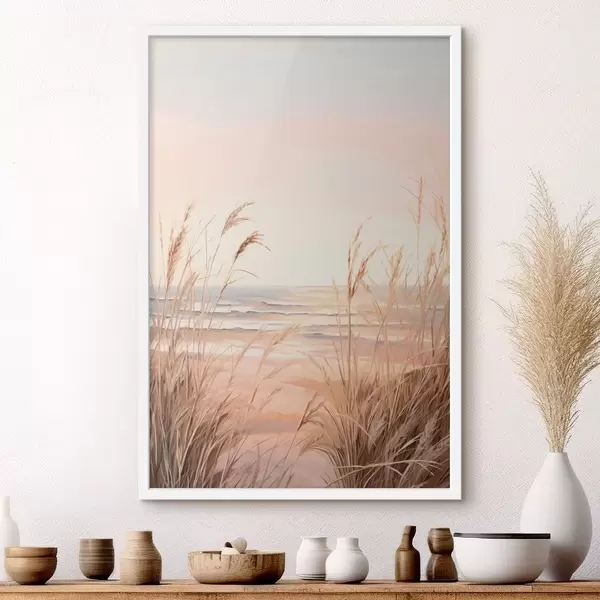 Plakatas Pampų žolė su pastelinės oranžinės spalvos palete, šviesiai rožinis dangus, ramus kraštovaizdis f45935