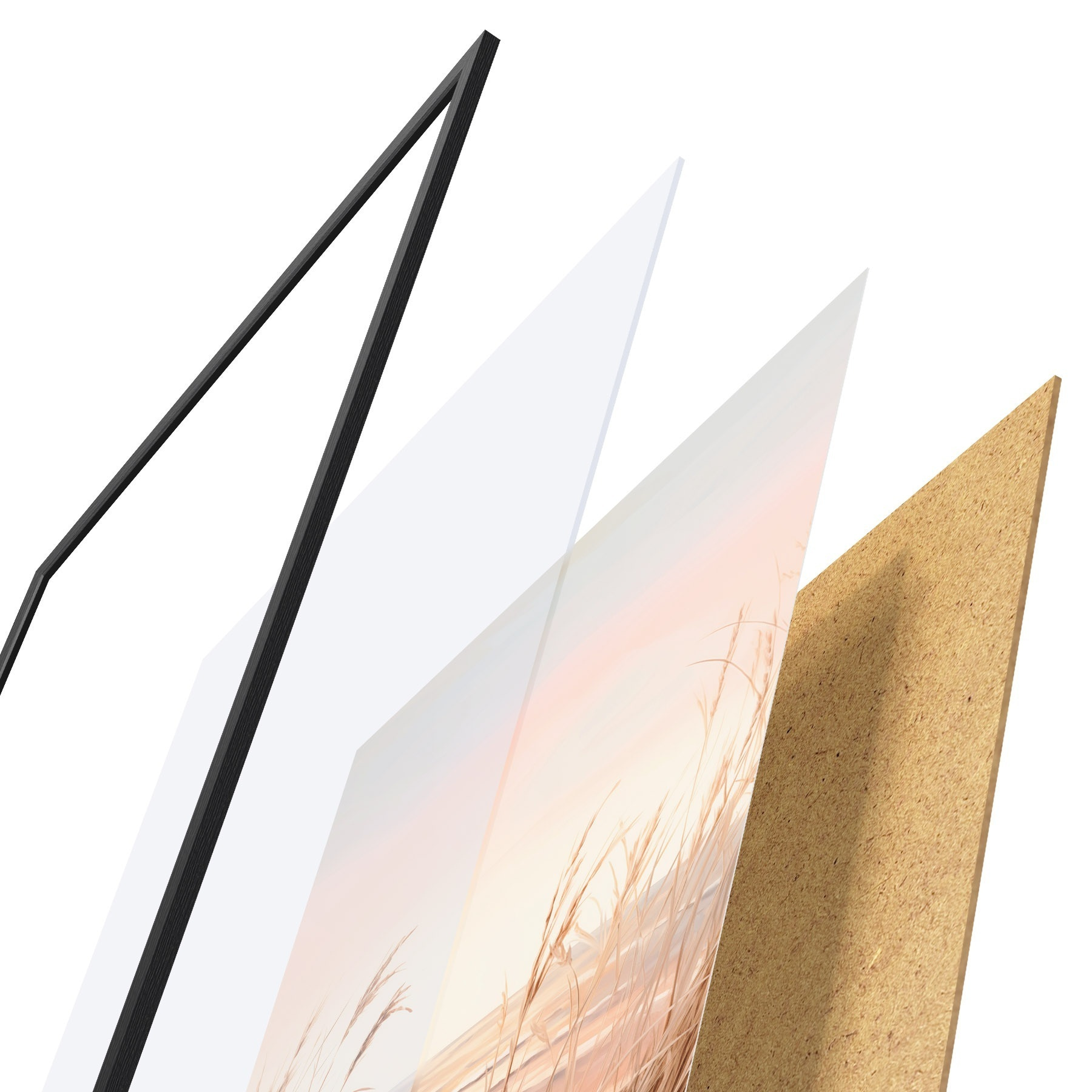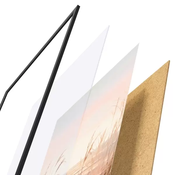 Plakatą sudaro rėmas, pleksiklas, atspausdintas vaizdas ir medžio drožlių plokštės pagrindas. Plakatą galima iš karto pakabinti ant sienos dėl kitoje pusėje esančių laikiklių.