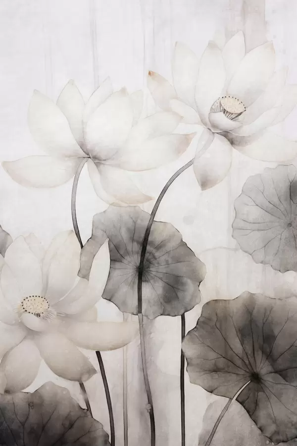 Plakatas Balta tekstūruota lotoso gėlė su tamsiais lapais, šviesus fonas, minimalistinis dizainas f45937